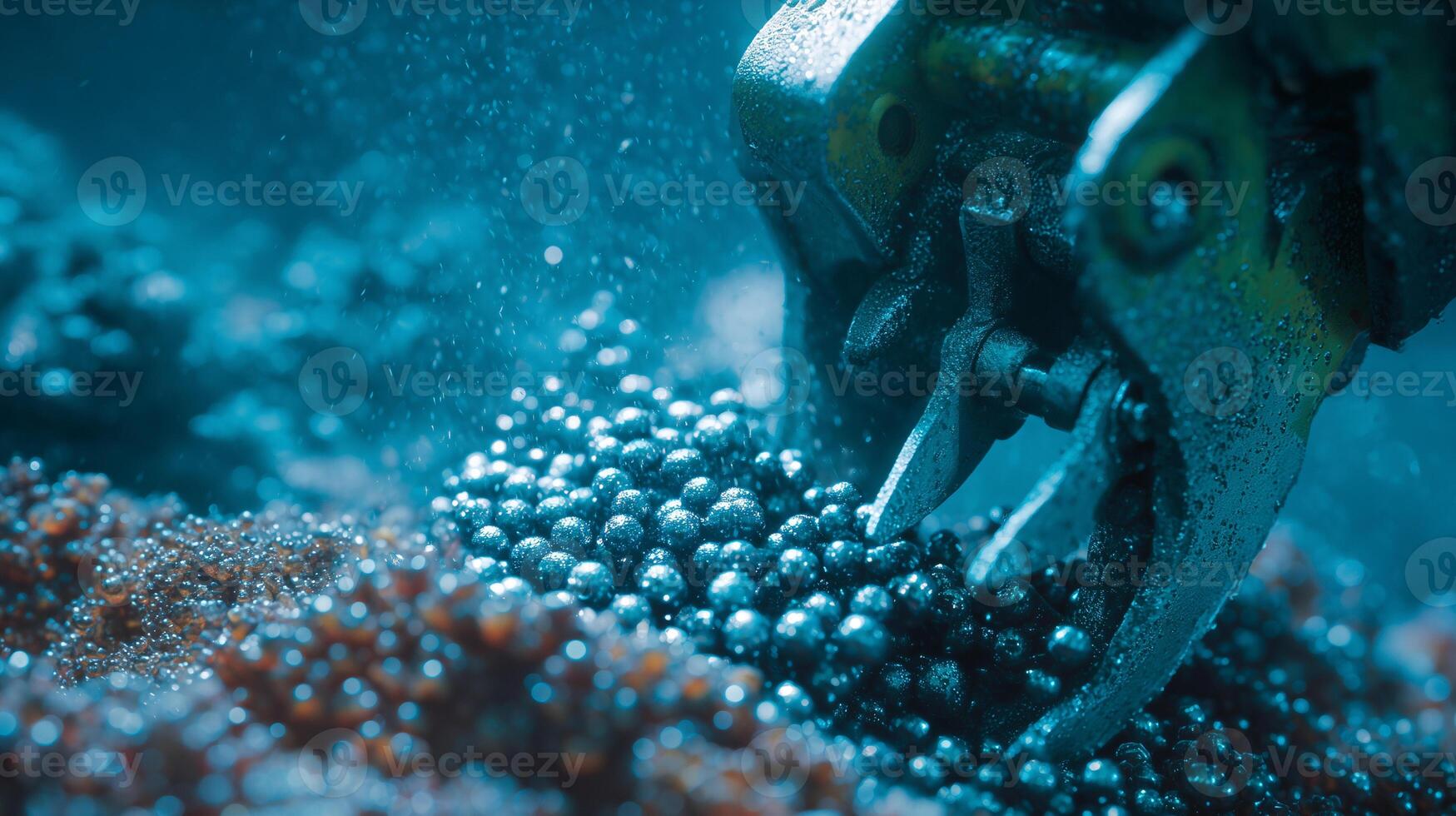 Underwater mining machine collecting polymetallic nodules from ocean floor. Robotic equipment harvesting mineral resources in deep sea with sediment clouds and spherical formations. Pro Photo