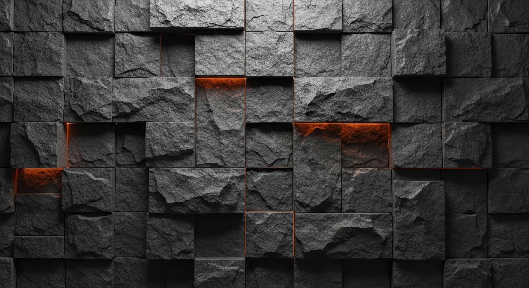 Close up of a textured dark gray stone block wall with orange light between some blocks design photo