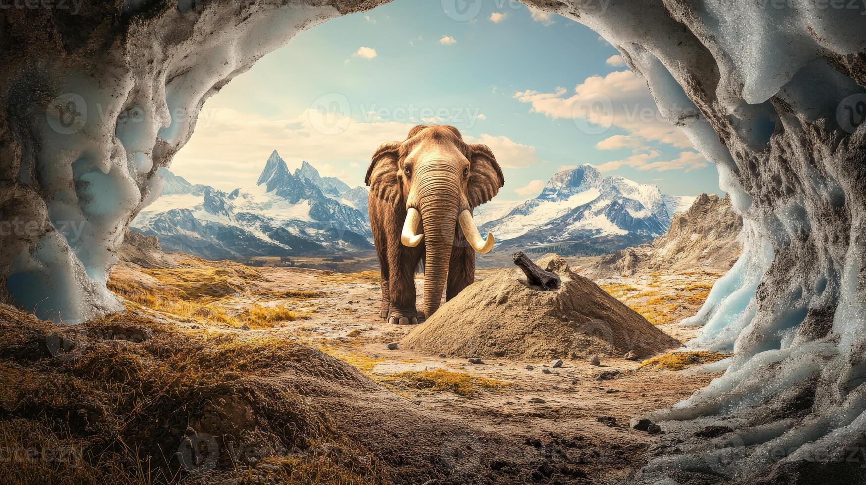 A large elephant stands in front of mountain. The scene is set in a mountainous area with snow-capped peaks in the distance Pro Photo