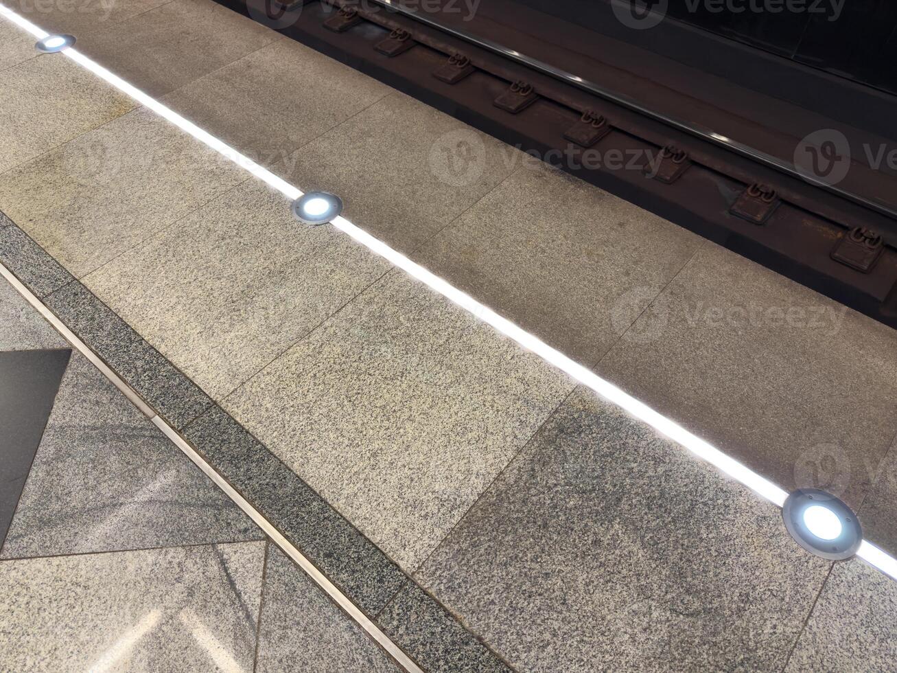 Lighted line in the subway to prevent accidents. Stand behind the line when a train arrives to ensure safety. Warning line at the edge of the platform is illuminated for visibility Pro Photo