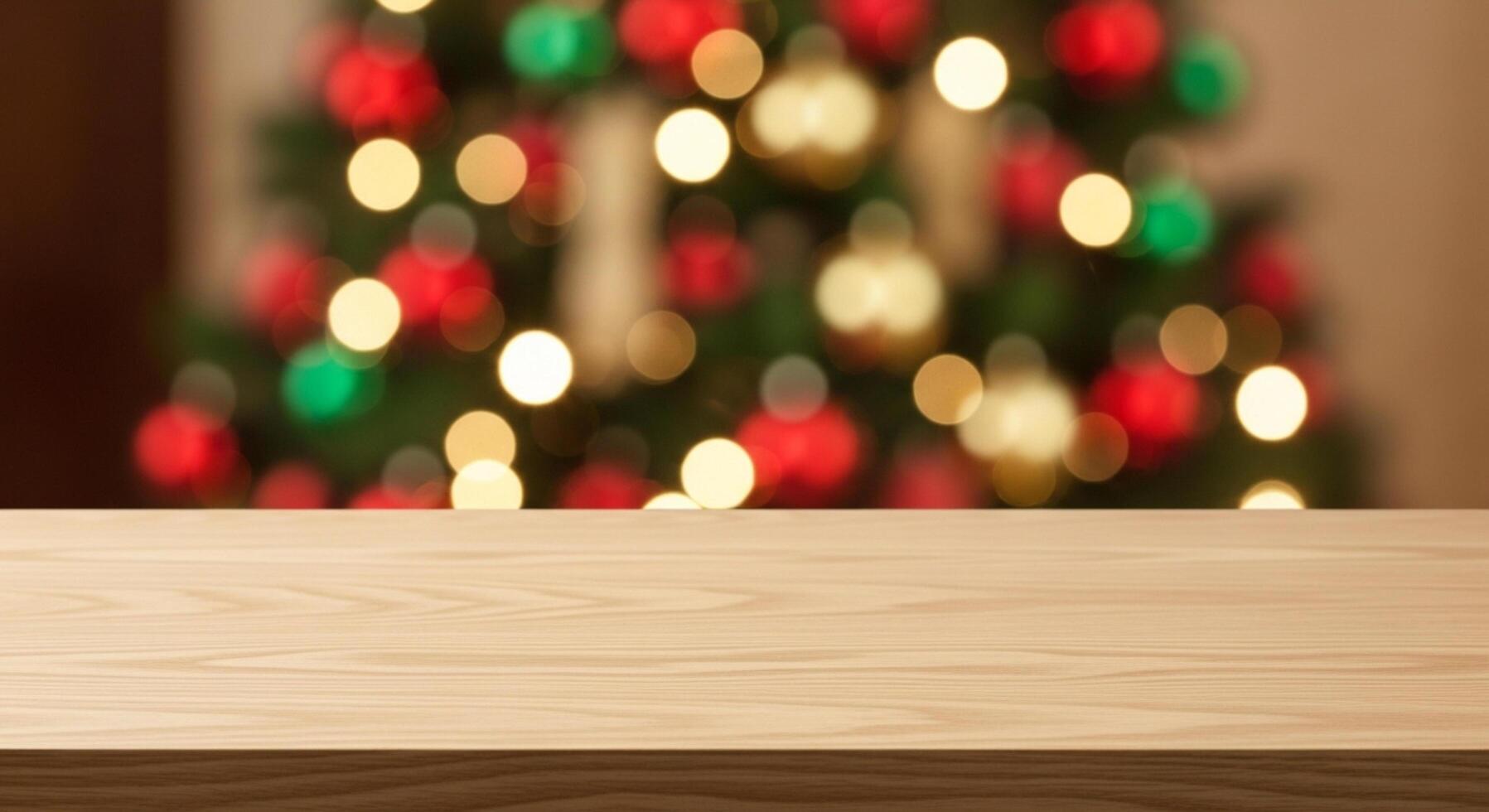 Warm wooden surface in front of a softly blurred festive Christmas tree with glowing bokeh lights creating a cozy holiday atmosphere. photo