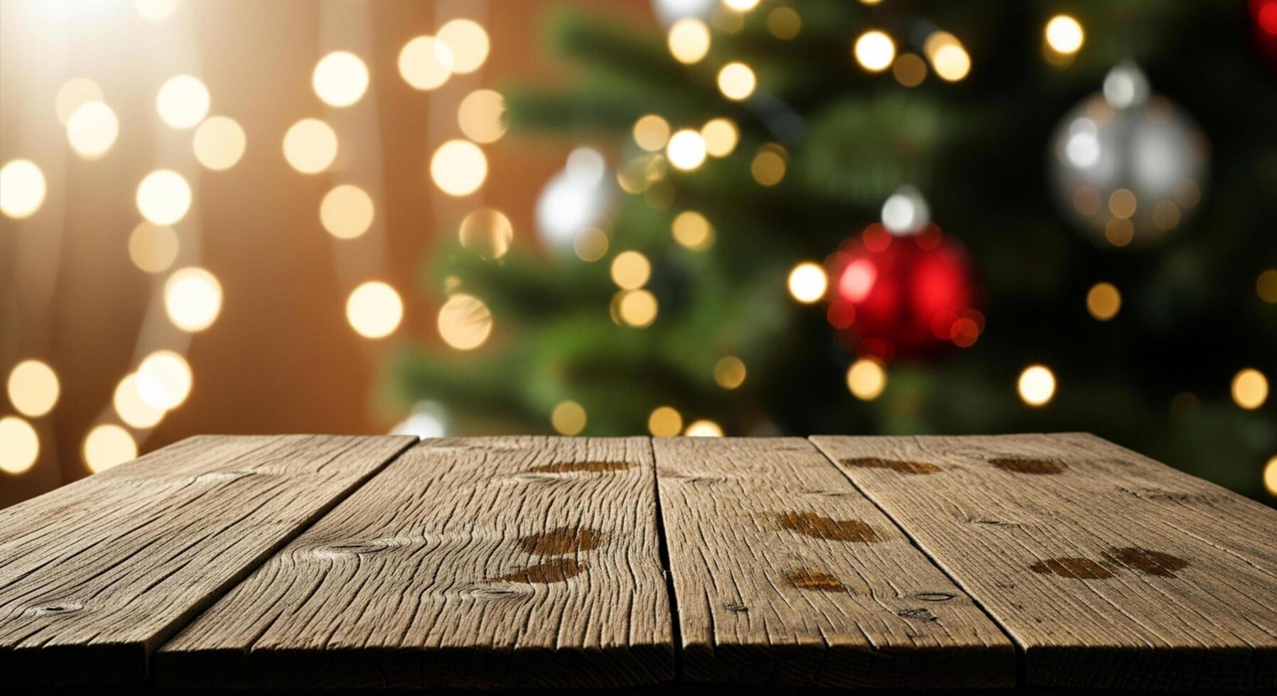 Rustic wooden table foreground with festive Christmas tree bokeh lights and ornaments creating a warm holiday atmosphere photo