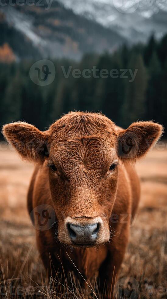 Brown calf stands in a field with mountains and trees in the background Pro Photo