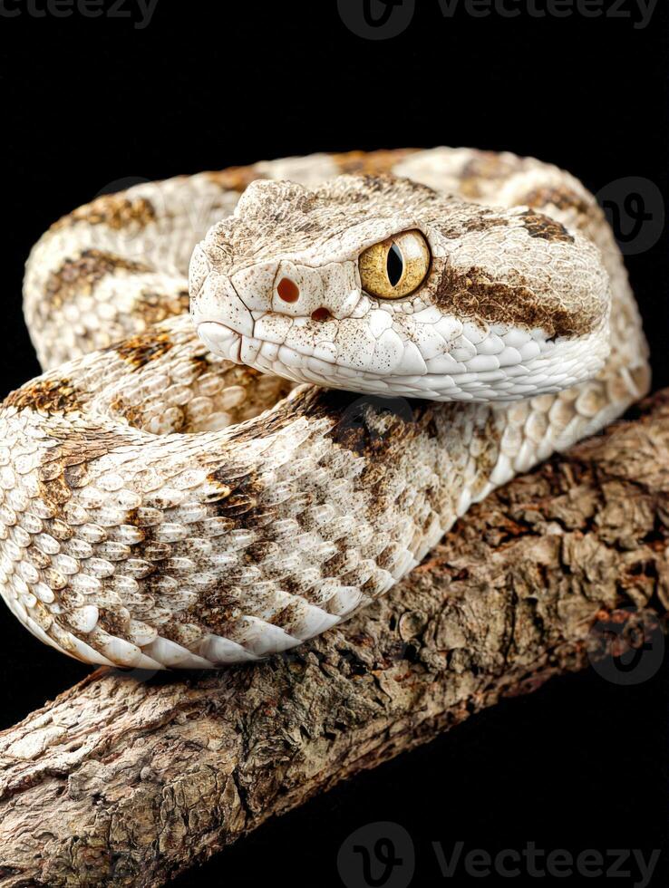 Captivating metallic viper displays golden eyes while resting on a branch Pro Photo
