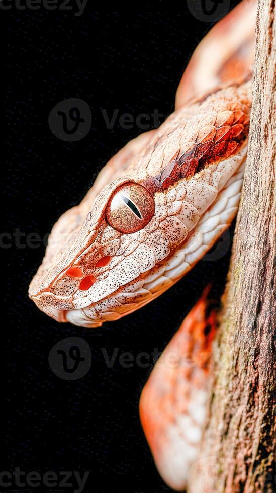 Metallic viper with golden eyes resting on a tree branch in a dark environment Pro Photo