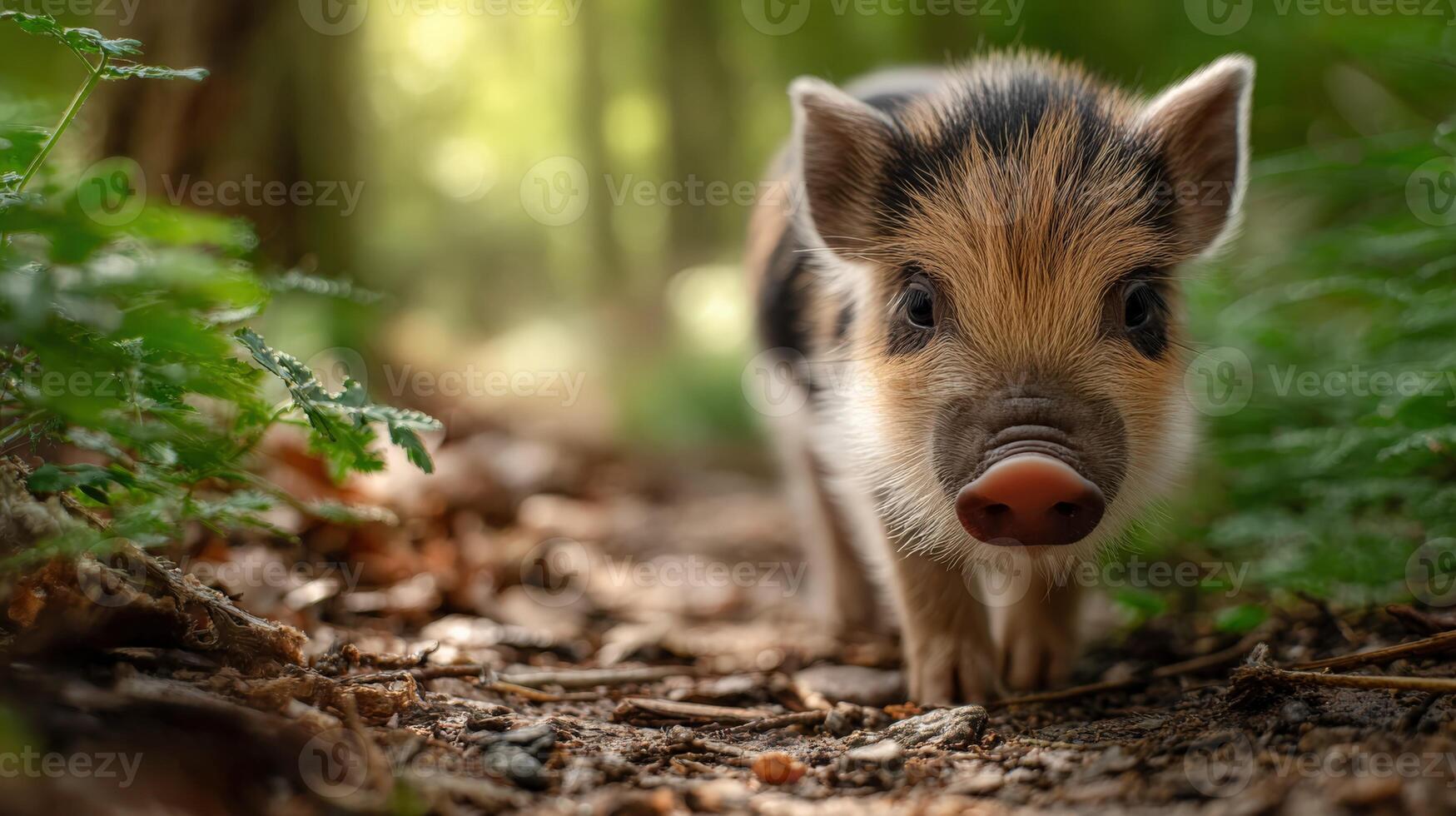 Smiling piglet exploring a lush forest path surrounded by soft golden light Pro Photo
