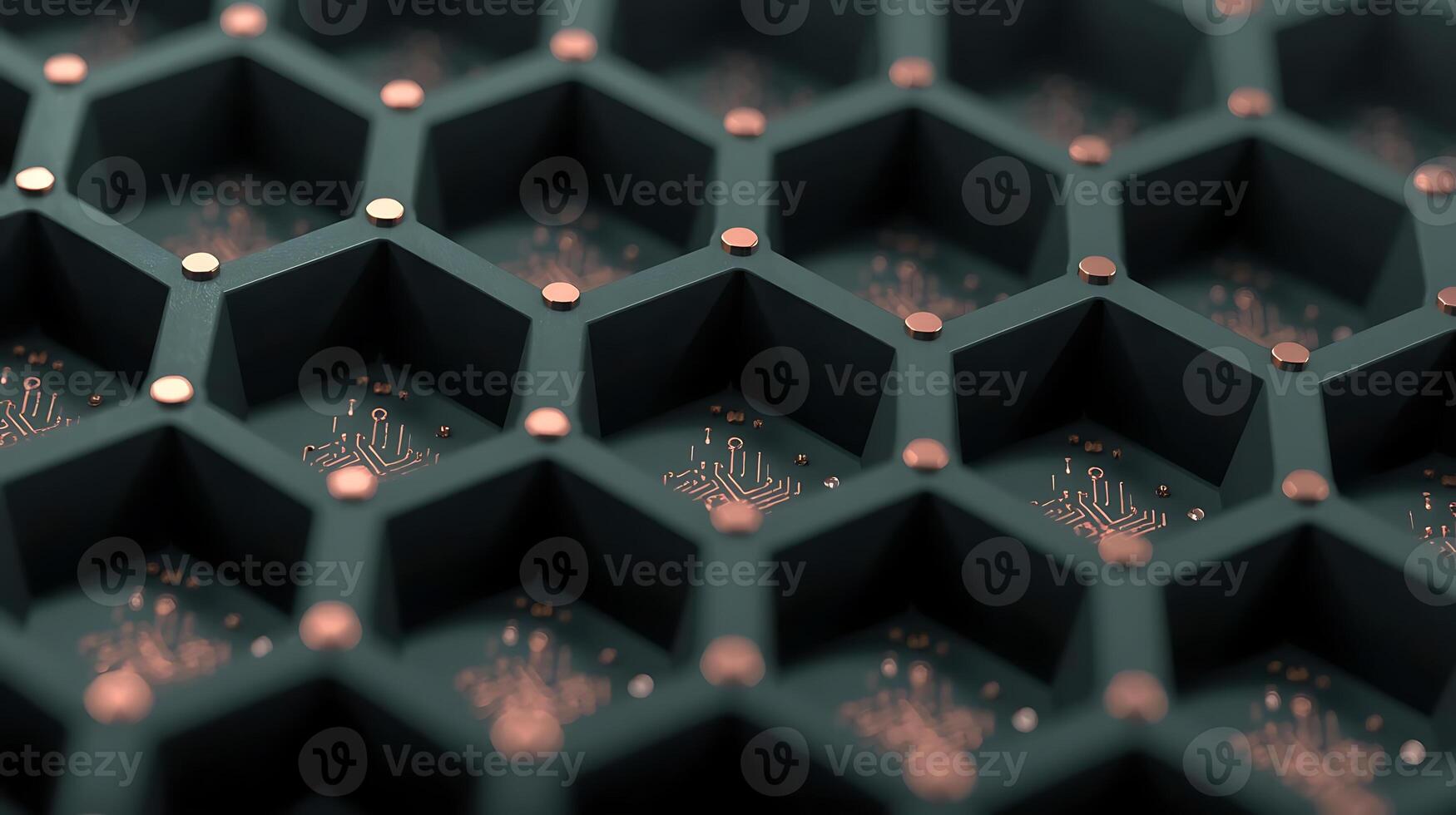 Abstract 3D render of a hexagon grid with copper circuit board patterns Pro Photo