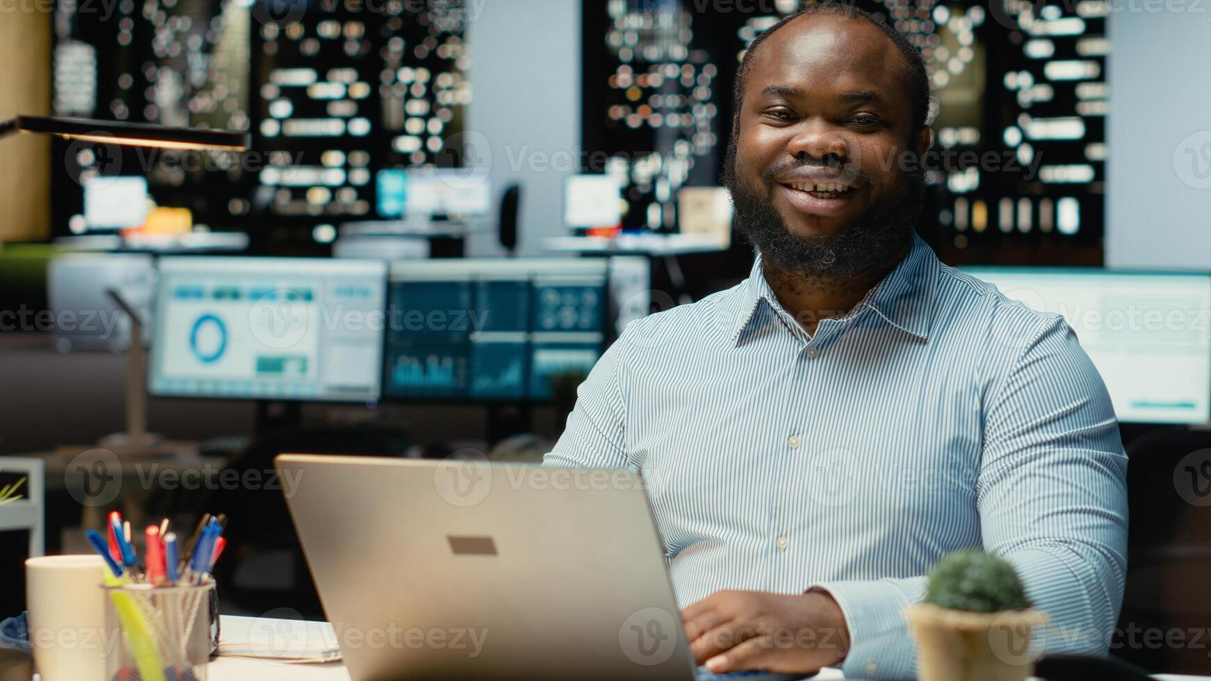 Portrait of male worker immersed in reading emails and researching data for a multinational company, working after hours in a dark office. Focusing on objectives for development. Pro Photo