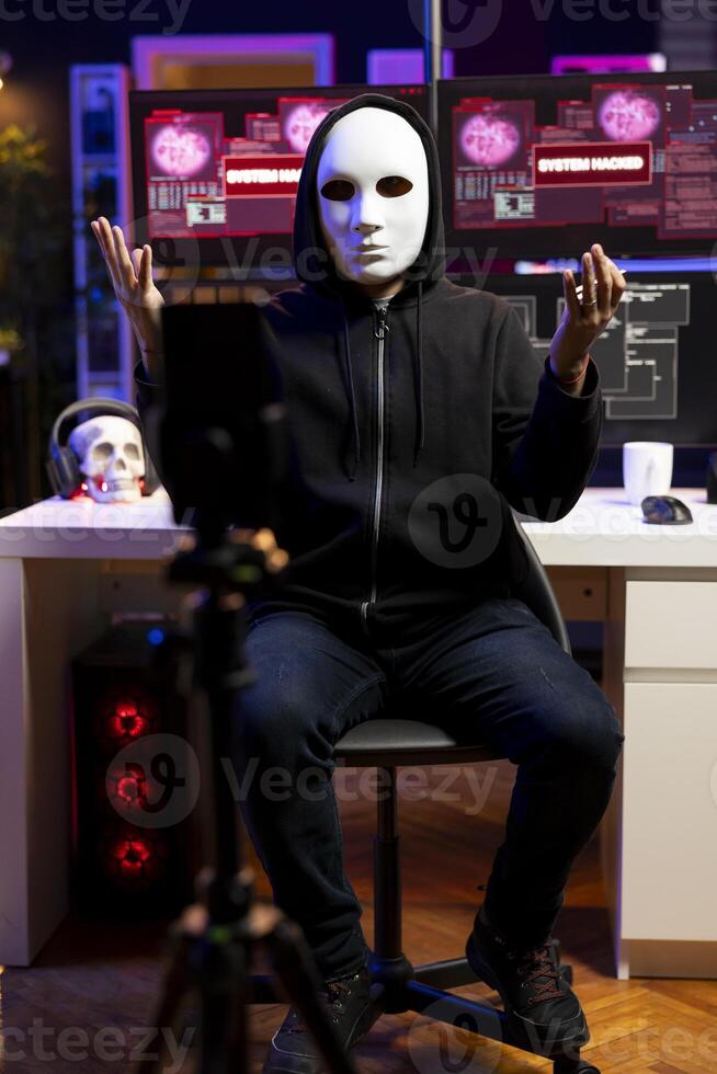Hacker hidden in underground lair sending ultimatum to foreign governments, hacking systems. Masked rogue programmer threatening retaliation against military target if his conditions are not met Pro Photo