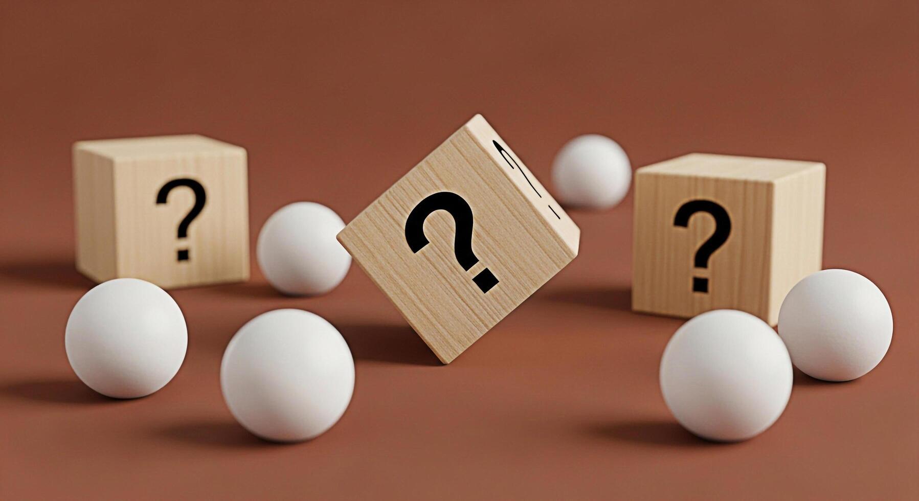 Wooden blocks displaying question marks surrounded by white spheres on a brown surface representing uncertainty curiosity and the search for answers in a minimalist and conceptual composition photo