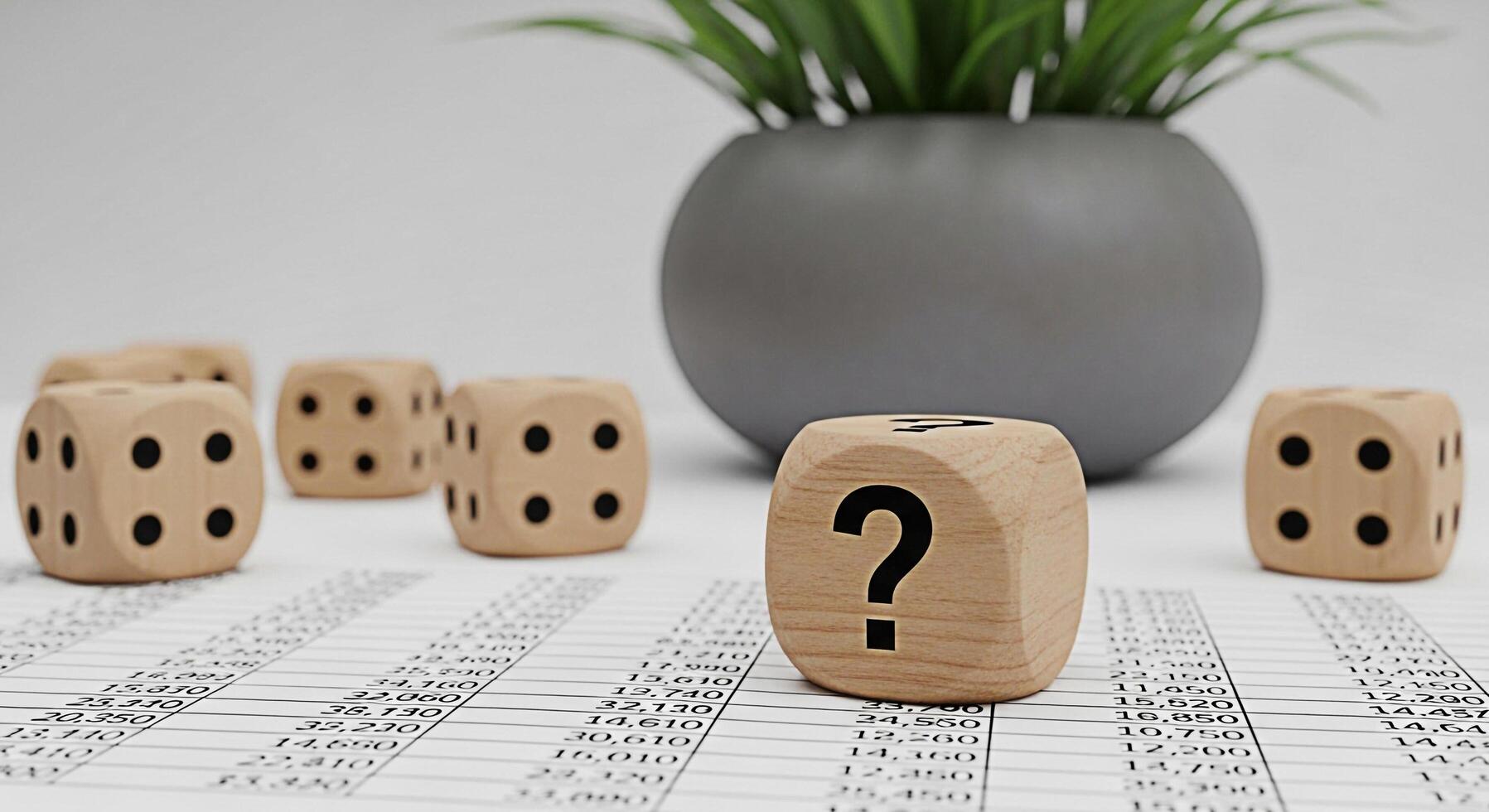 Wooden dice with a question mark facing forward on a financial report in a bright studio setting symbolizing uncertainty and risk in business decisions and investment strategies creating a sense of co photo