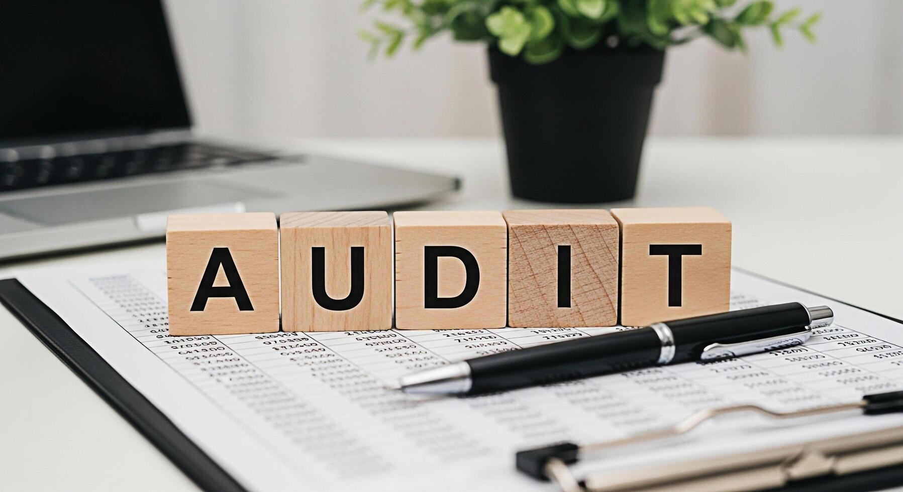 Wooden blocks spelling AUDIT resting on financial documents in a bright office setting symbolizing financial review accuracy and compliance with a focus on detail and precision in accounting practices Free Photo