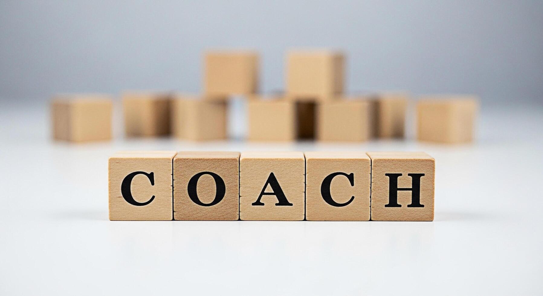 Wooden blocks spelling COACH on a white surface symbolizing guidance and support with a blurred background of additional blocks creating a sense of depth and focus on the coaching concept Free Photo