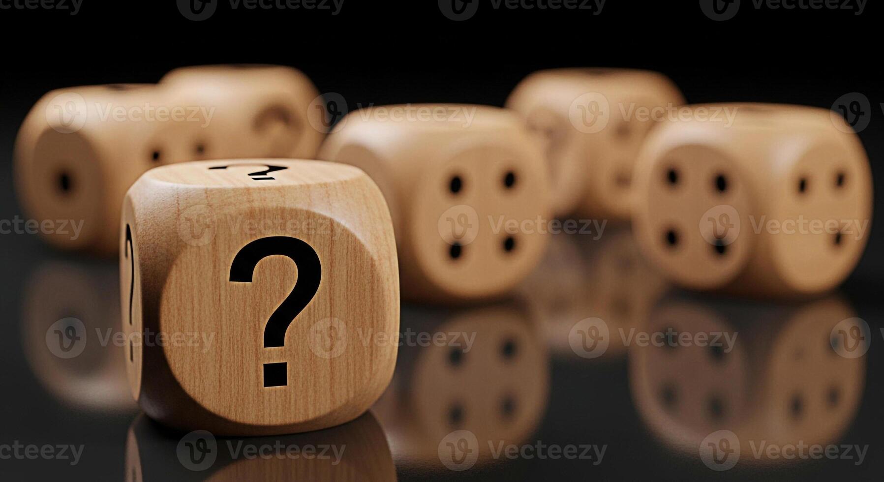 Wooden dice with a question mark face resting on a reflective surface among other dice symbolizing uncertainty risk and the need for decisionmaking in business and life creating a mysterious mood Pro Photo