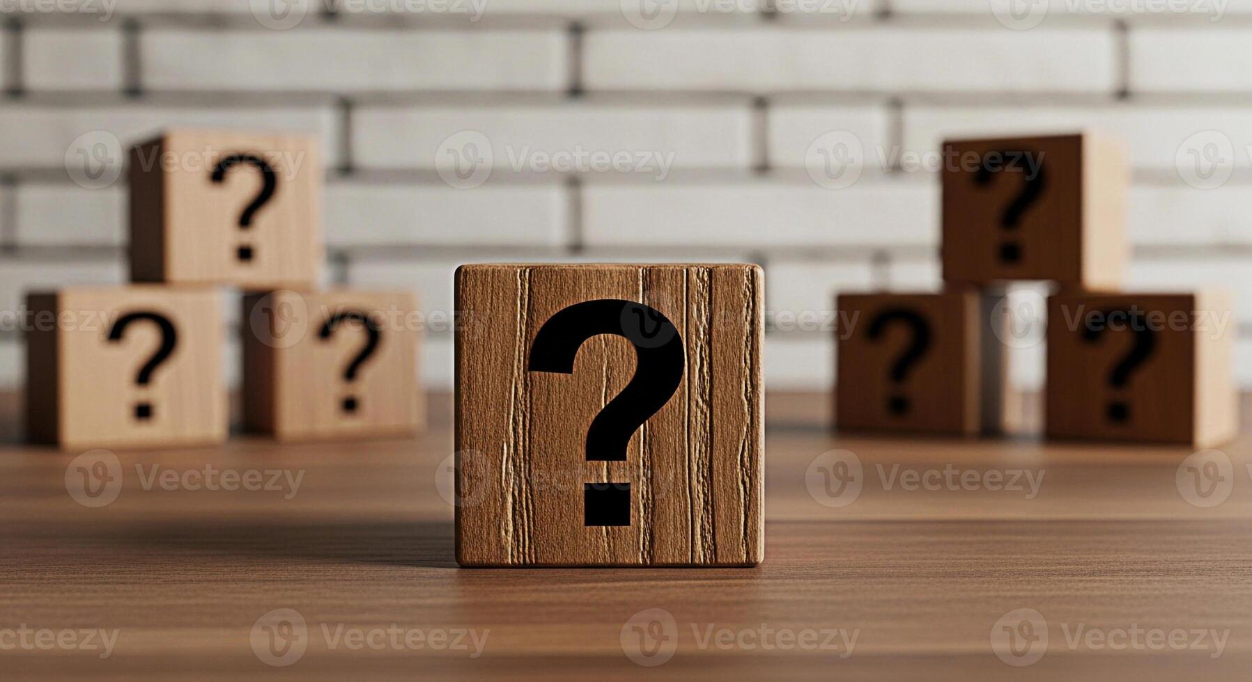 Wooden blocks displaying question marks sitting on a wooden table against a white brick wall symbolizing uncertainty and the need for answers in a complex and challenging situation Pro Photo