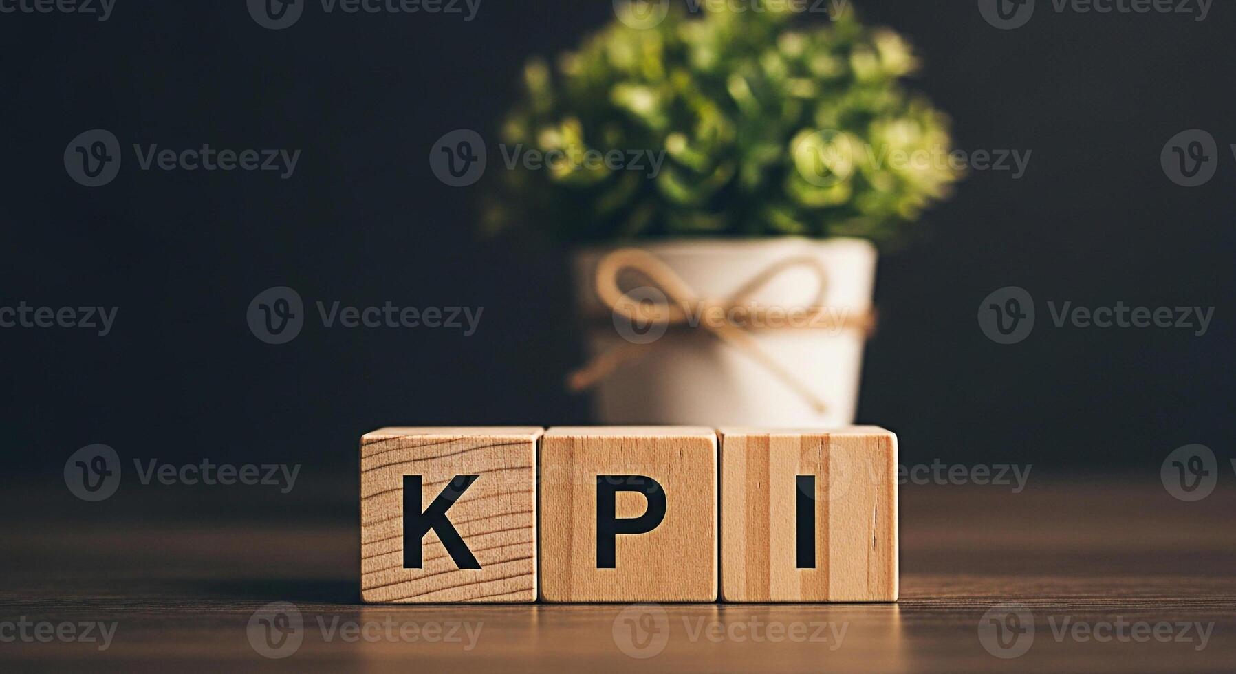 Wooden blocks displaying KPI on a dark wooden surface with a blurred potted plant in the background representing key performance indicators and business success in a professional setting Pro Photo