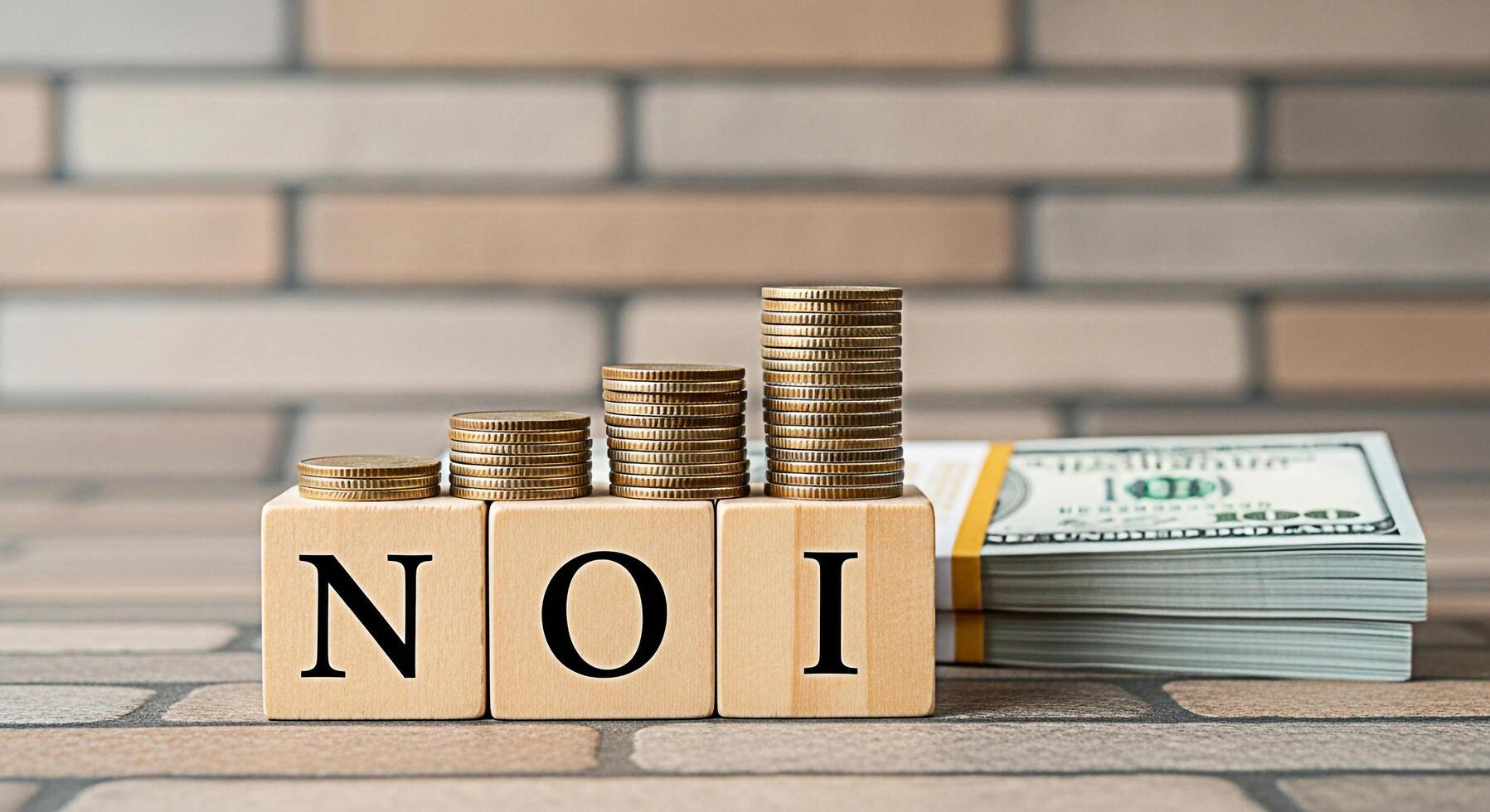 Wooden blocks spelling NOI display increasing stacks of coins and a bundle of US dollar bills on a textured surface representing net operating income and financial growth in a business setting photo