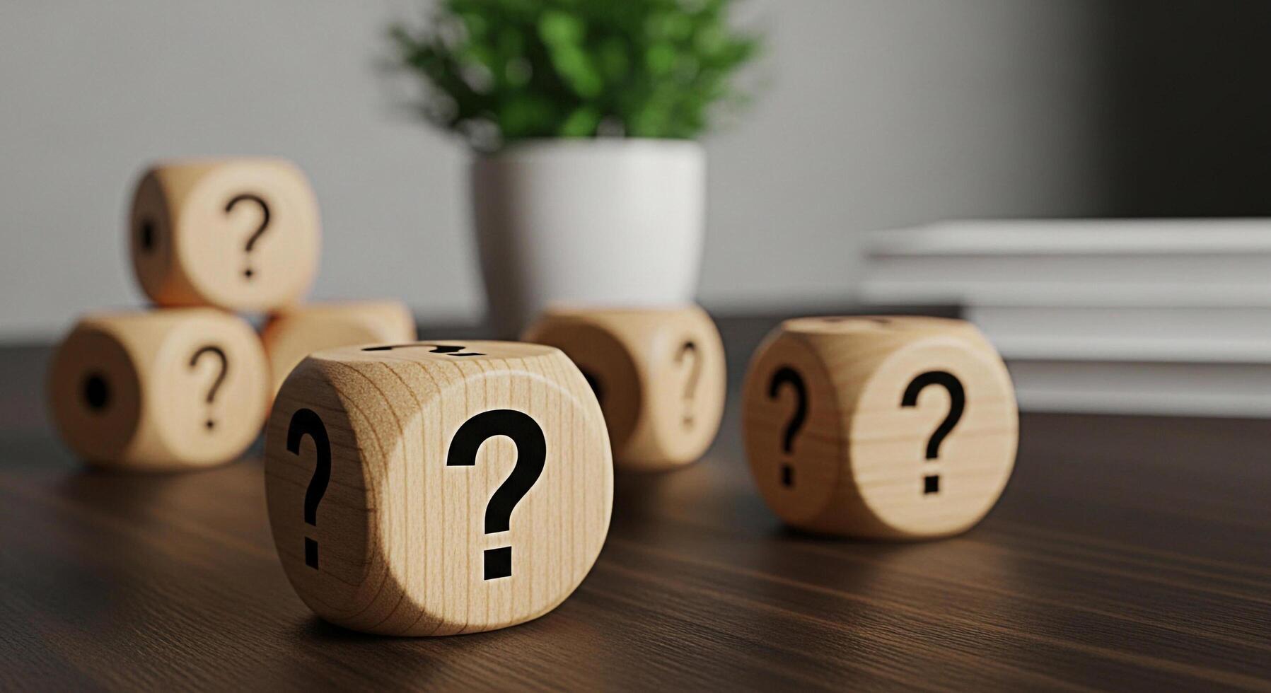 Wooden dice displaying question marks on a dark wooden table in a bright room representing uncertainty problemsolving and the search for answers in business and personal life challenges Free Photo