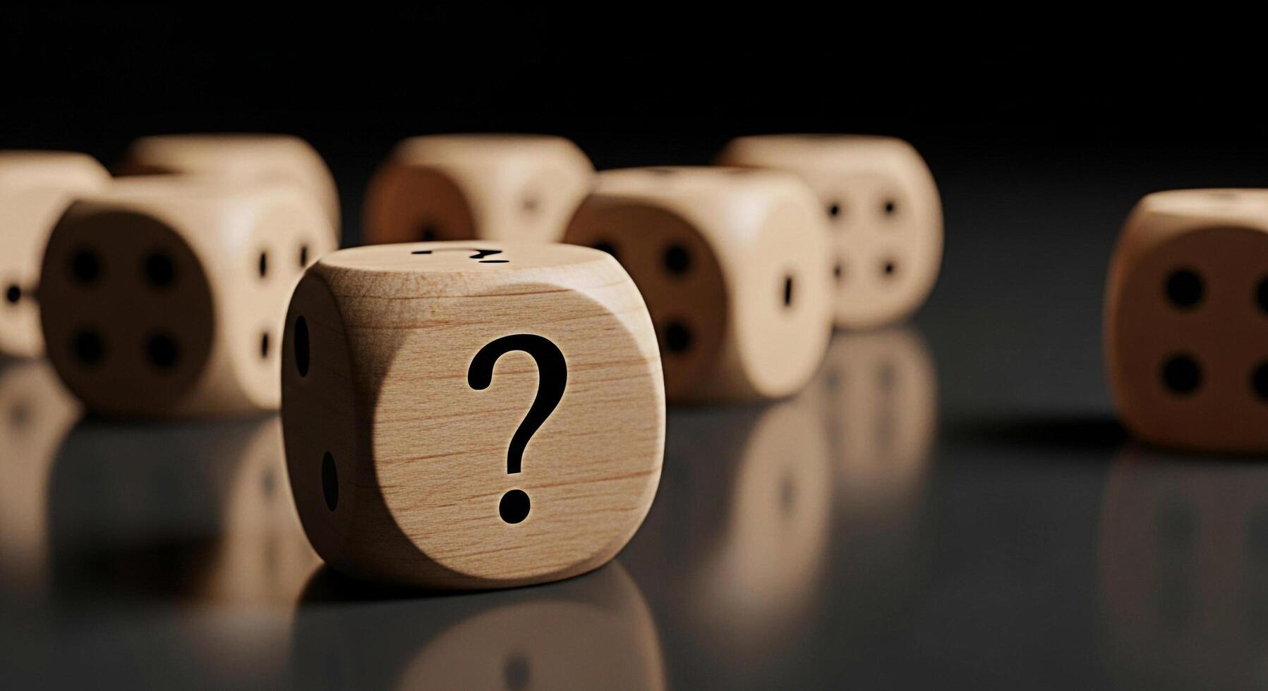 Wooden dice displaying a question mark on a reflective surface representing uncertainty and decisionmaking in a dark and mysterious setting creating a sense of intrigue and contemplation Free Photo