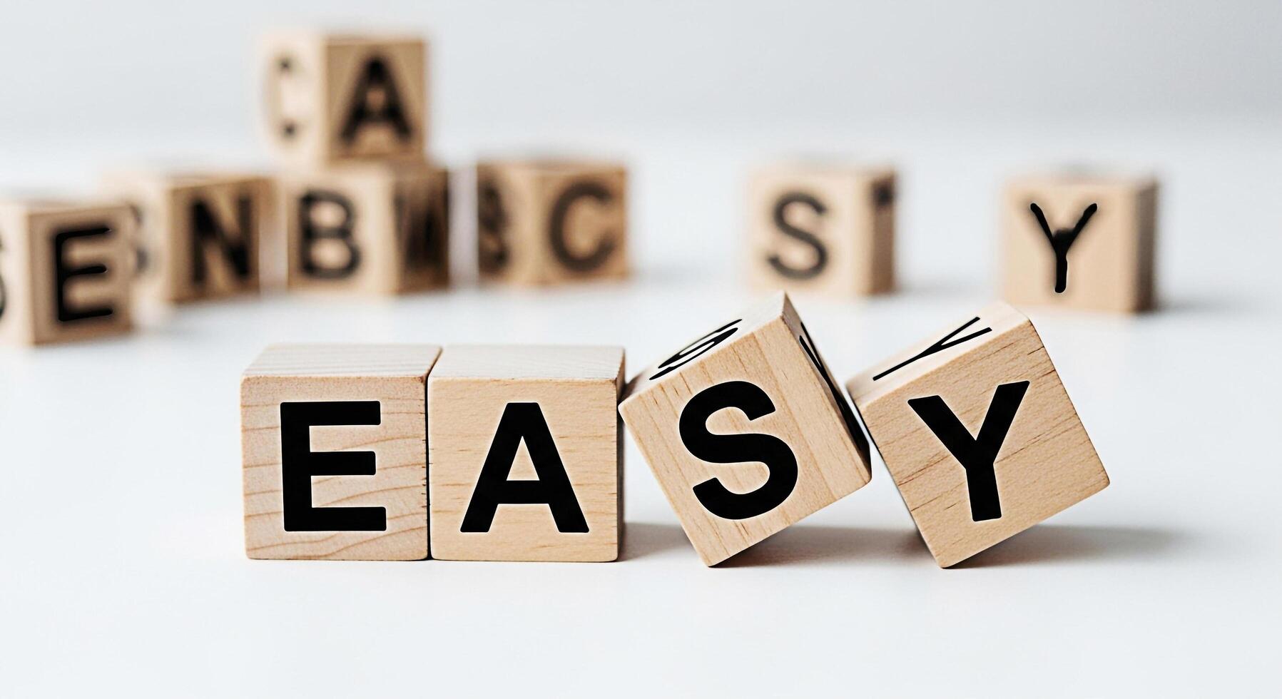 Wooden blocks spelling EASY on a white surface conveying simplicity and accessibility in a clean minimalist setting suggesting a straightforward solution or approach to challenges photo