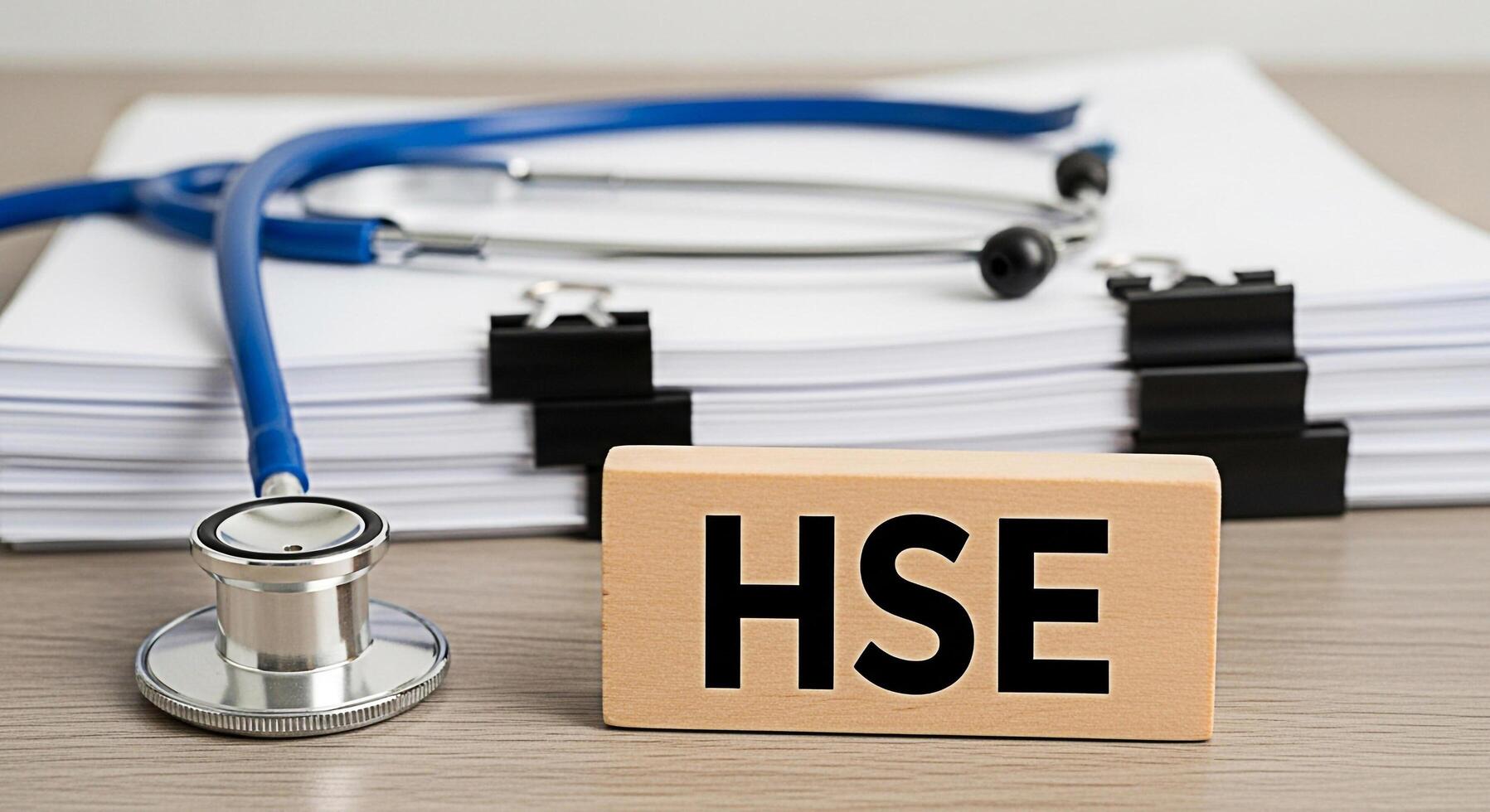 Wooden block displaying HSE next to a blue stethoscope and a stack of documents on a wooden desk representing health safety and environment compliance in a workplace setting emphasizing workplace safe photo