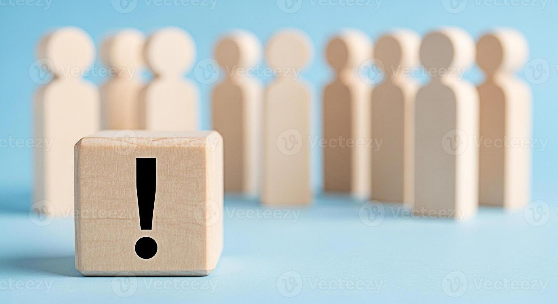 Wooden block displaying an exclamation mark stands out from a group of wooden figures on a blue background symbolizing warning attention and the importance of standing out from the crowd Pro Photo