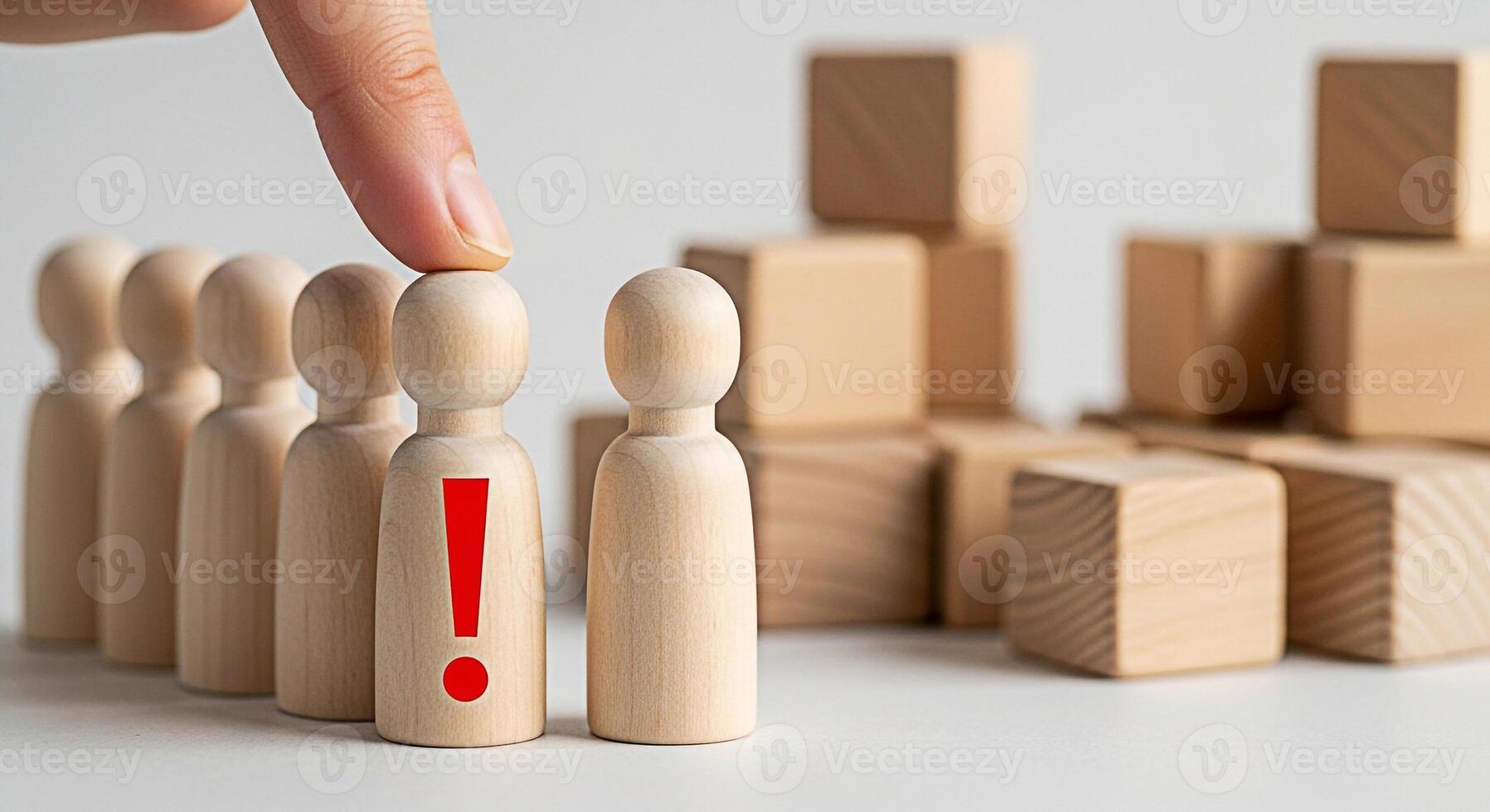 Hand selecting a wooden figure with an exclamation mark from a group symbolizing risk assessment and problem identification in a business strategy with wooden blocks in the background conveying a sens Pro Photo