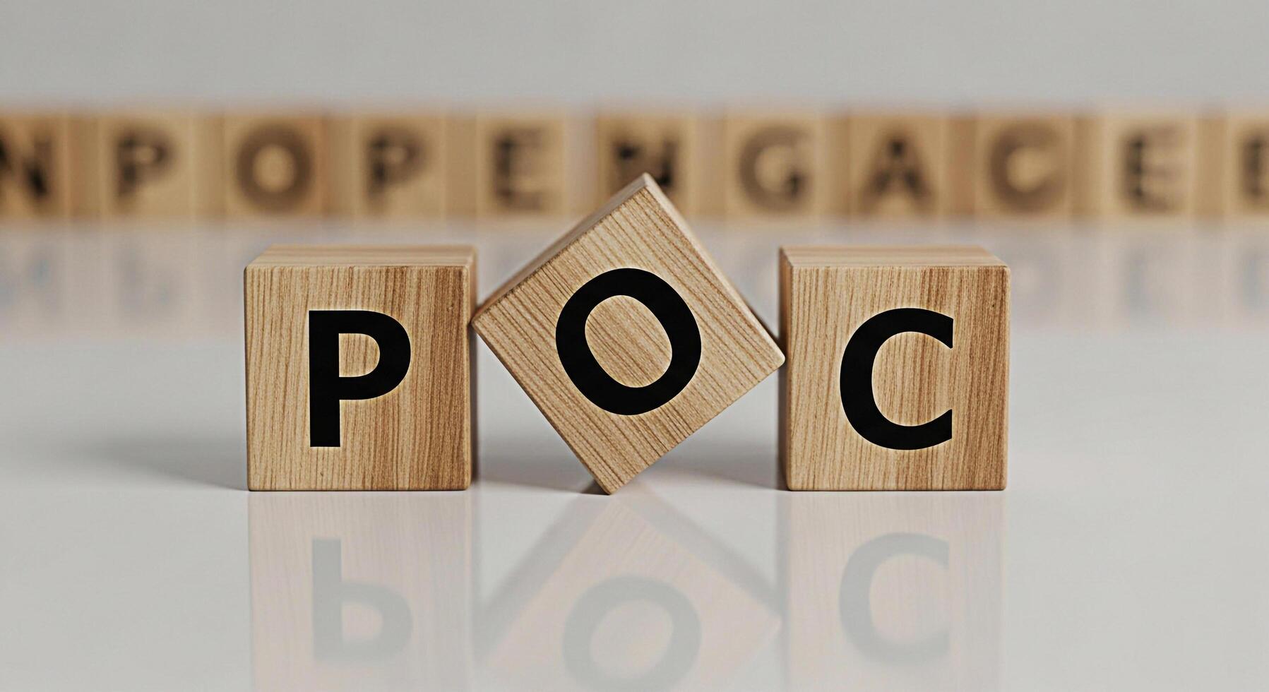 Wooden blocks spelling POC on a white reflective surface representing proof of concept in a minimalist setting conveying innovation and strategic planning for business development and technological ad Free Photo