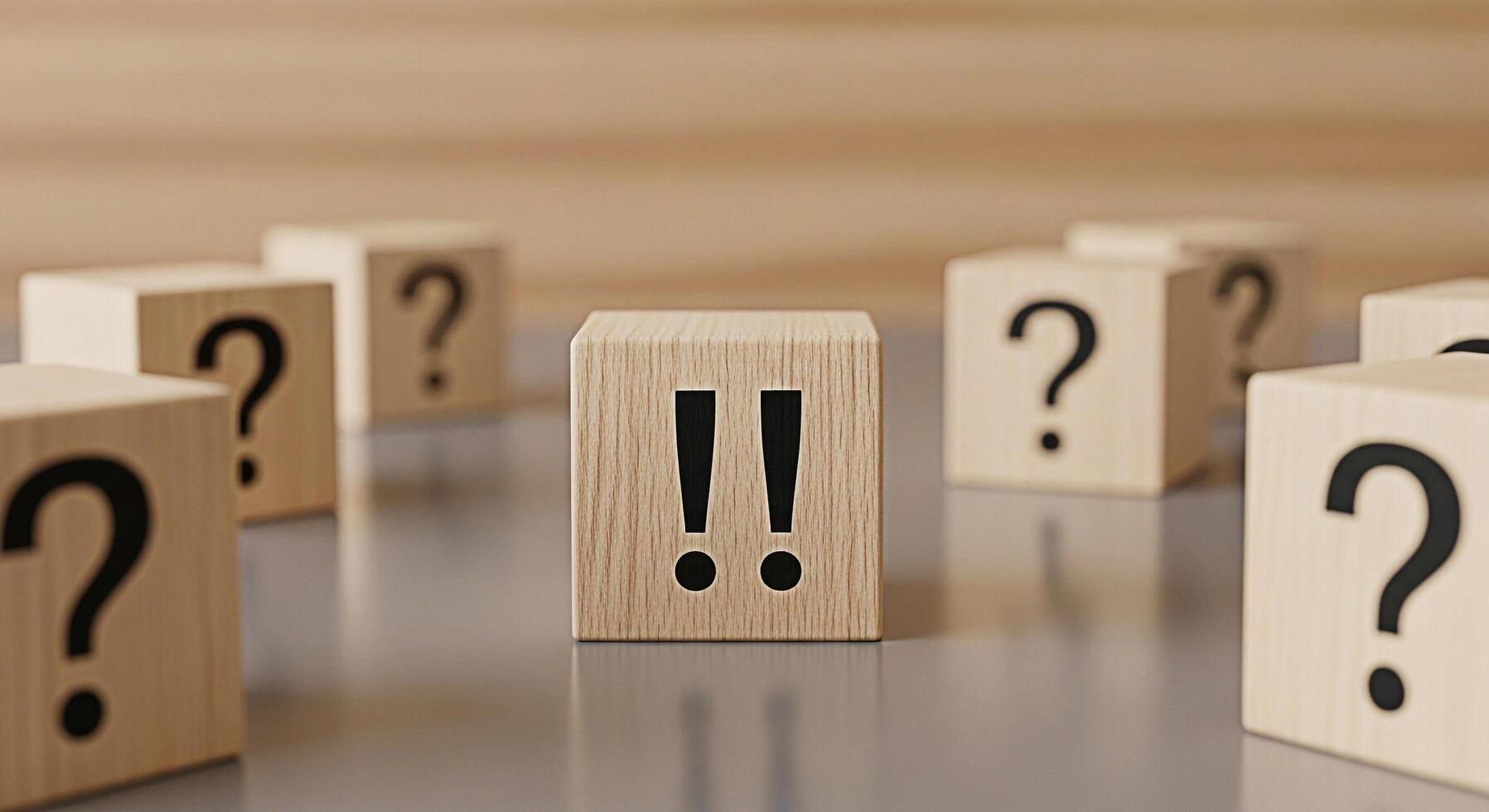 Wooden blocks displaying exclamation points and question marks on a neutral surface representing answers and uncertainty in a conceptual and minimalist composition ideal for problemsolving and decisio Free Photo
