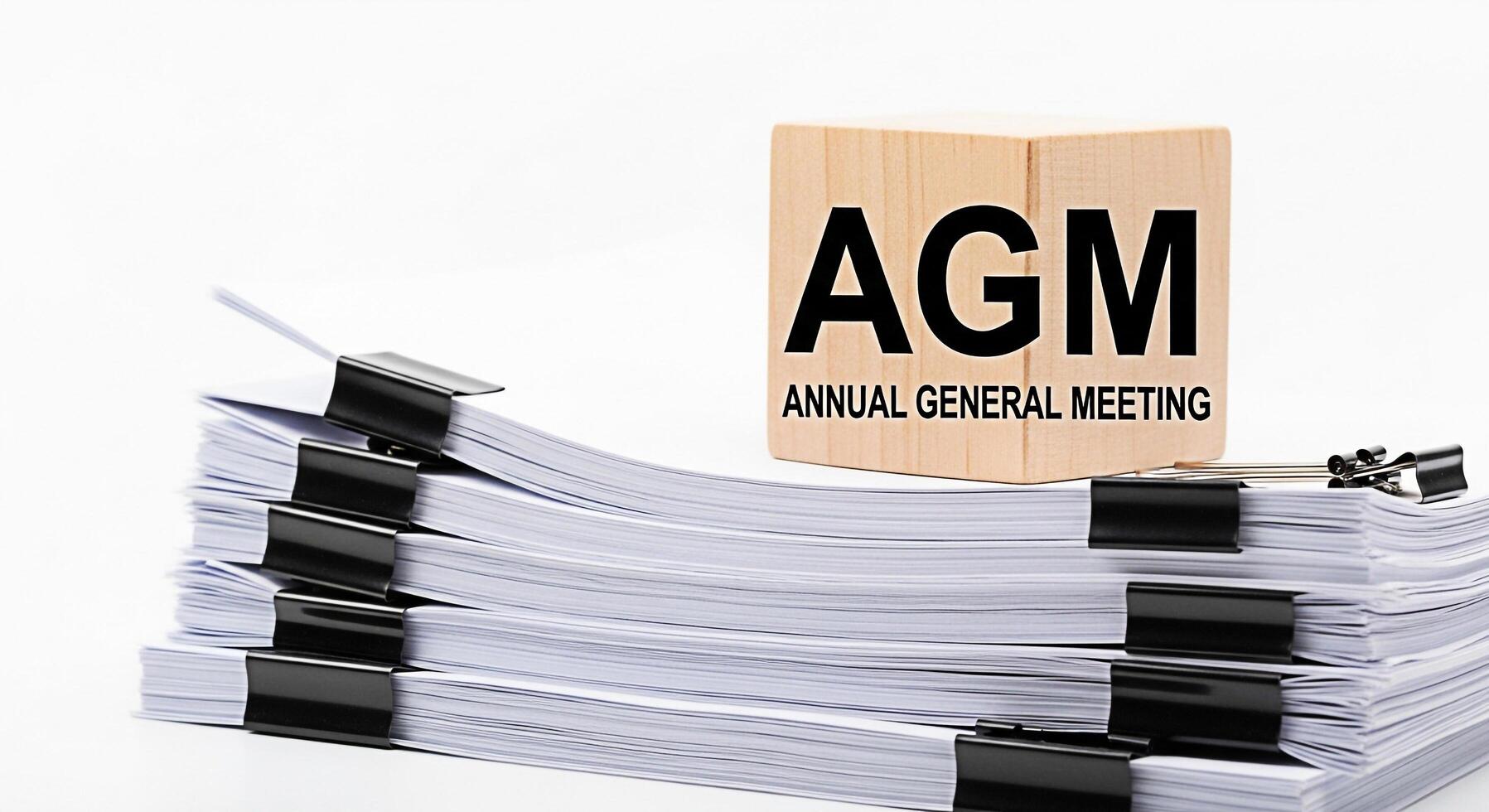Stack of documents secured with binder clips next to a wooden block displaying AGM Annual General Meeting on a clean white background representing corporate governance and shareholder communication photo