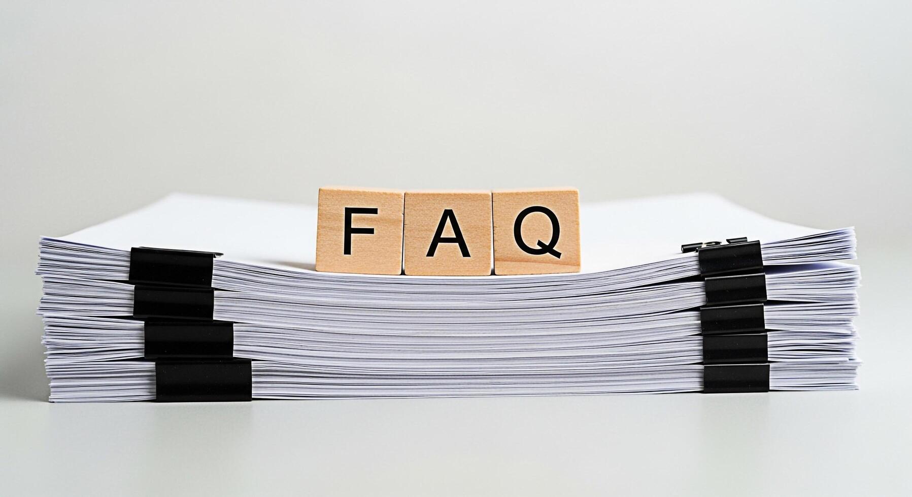 Stack of white papers displaying FAQ on wooden blocks in a bright office representing frequently asked questions information and support for customers and clients conveying clarity and assistance Free Photo