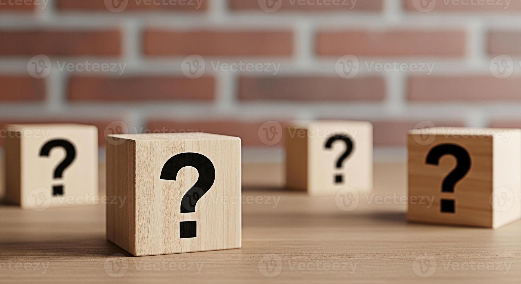 Wooden blocks displaying question marks on a wooden table against a brick wall representing uncertainty inquiry and the search for answers in a challenging and thoughtprovoking environment Pro Photo