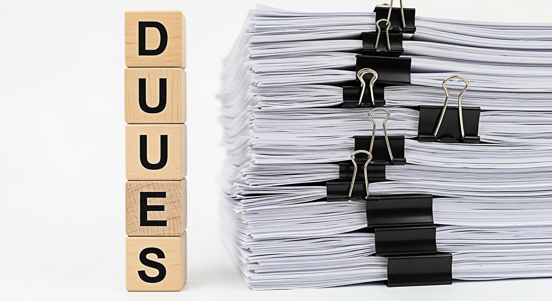 Stack of overdue invoices and documents secured with binder clips next to wooden blocks spelling DUES on a white background representing financial obligations and deadlines with a sense of urgency Free Photo