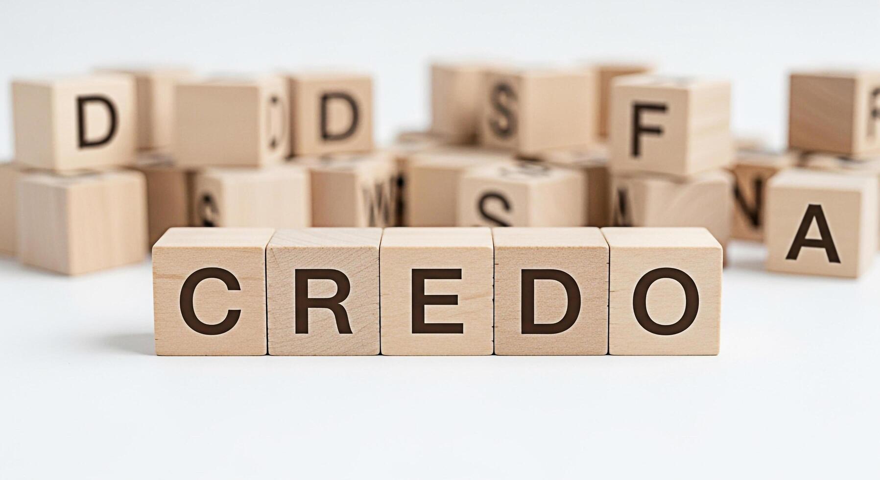 Wooden blocks spelling CREDO on a white surface representing beliefs and principles conveying a sense of conviction and commitment in a minimalist setting ideal for business and ethical concepts Free Photo