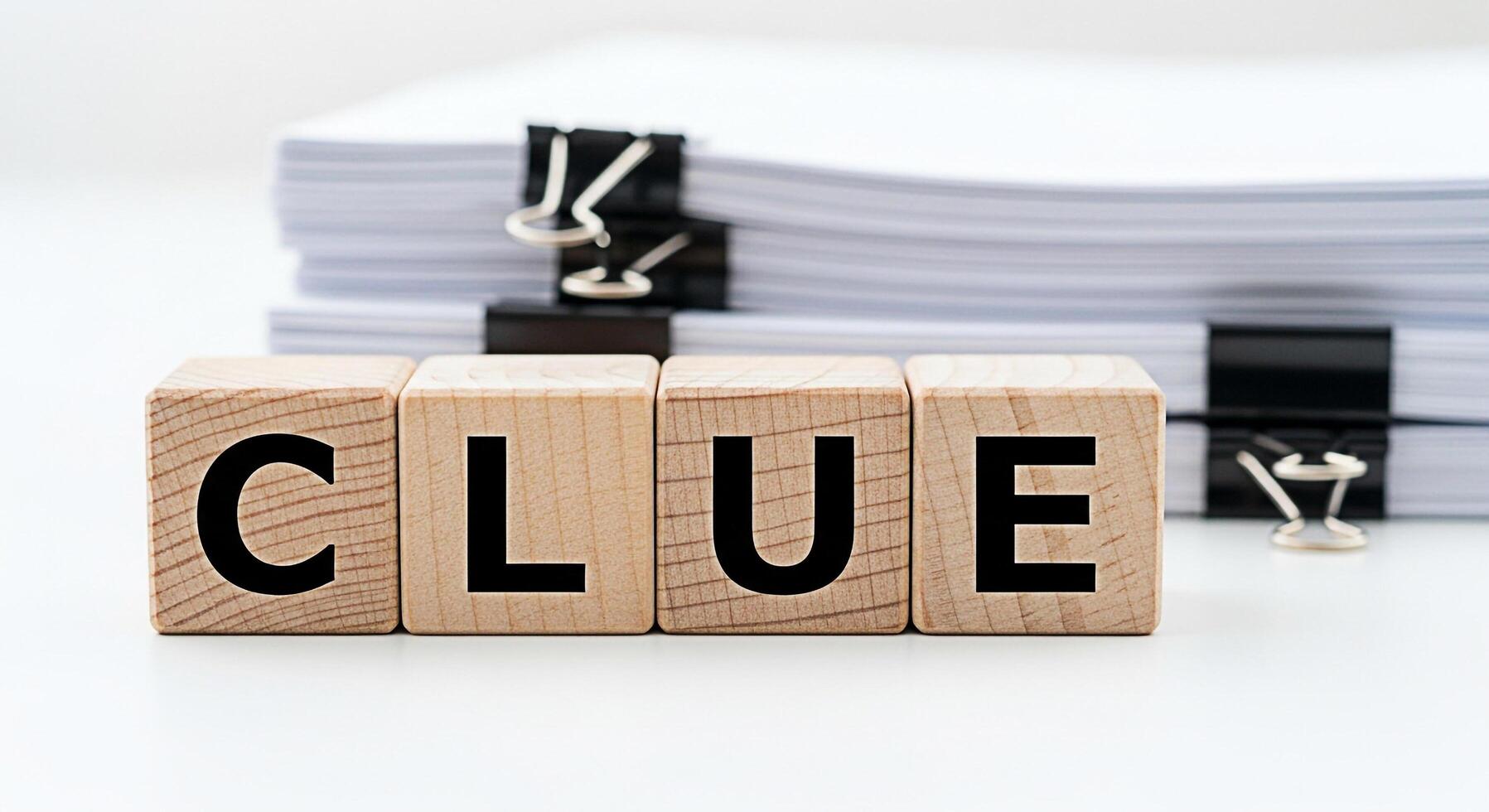 Wooden blocks spelling CLUE resting on a white surface with a stack of documents in the background suggesting investigation mystery or problemsolving in a professional or academic setting Free Photo