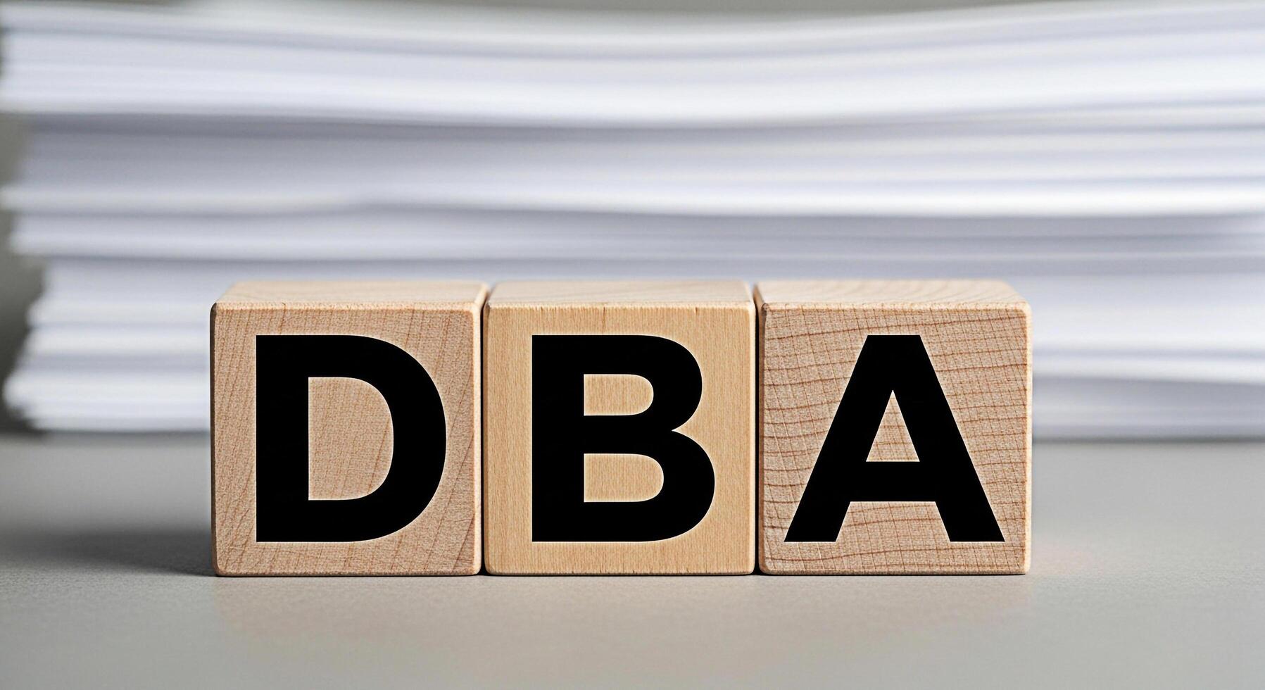 Wooden blocks displaying the acronym DBA on a gray surface with a stack of white papers in the background representing business operations and the concept of doing business as photo