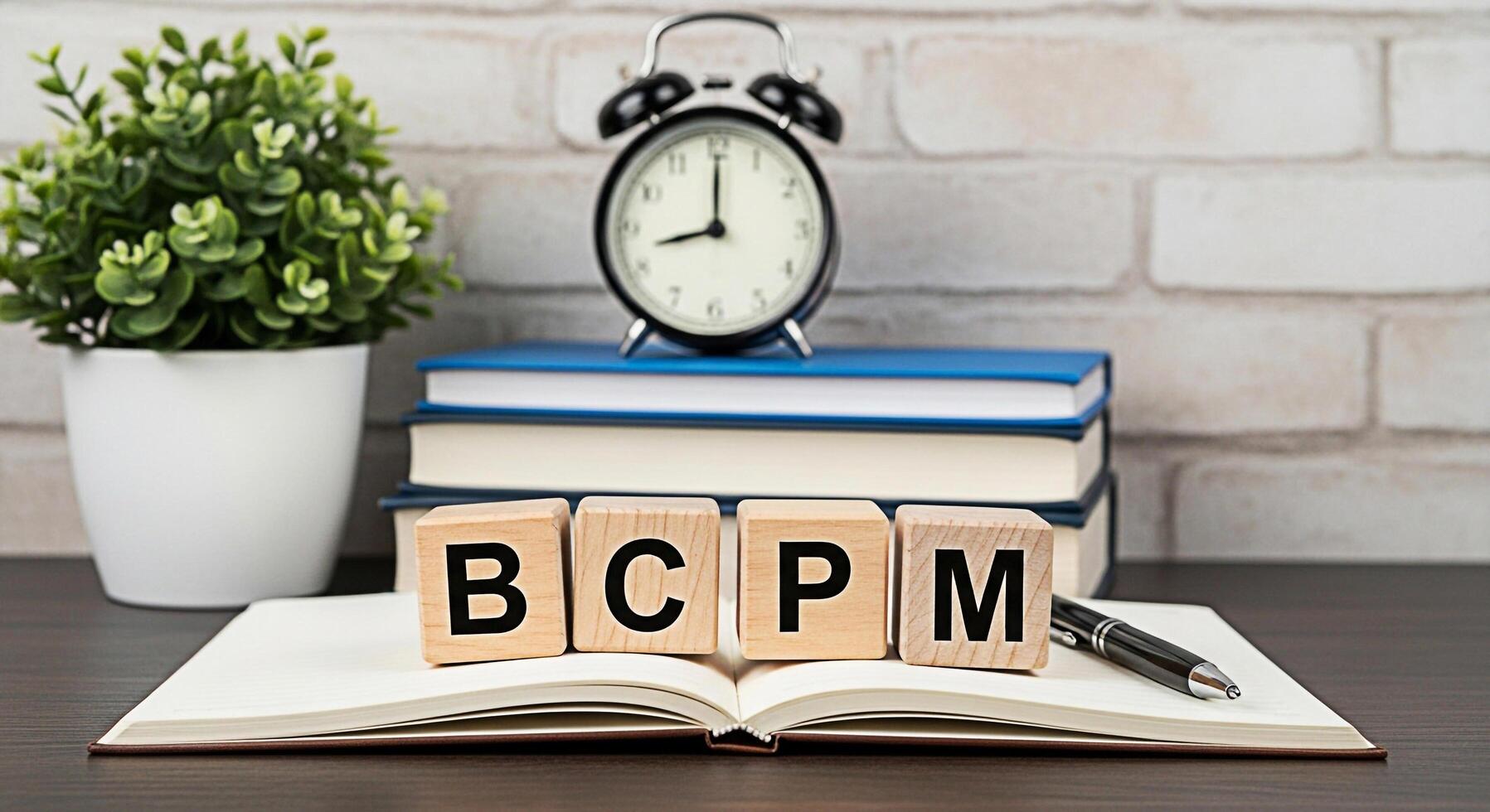Wooden blocks spelling BCPM resting on an open notebook with a pen set against a brick wall backdrop with books a clock and a plant suggesting business continuity and project management concepts photo