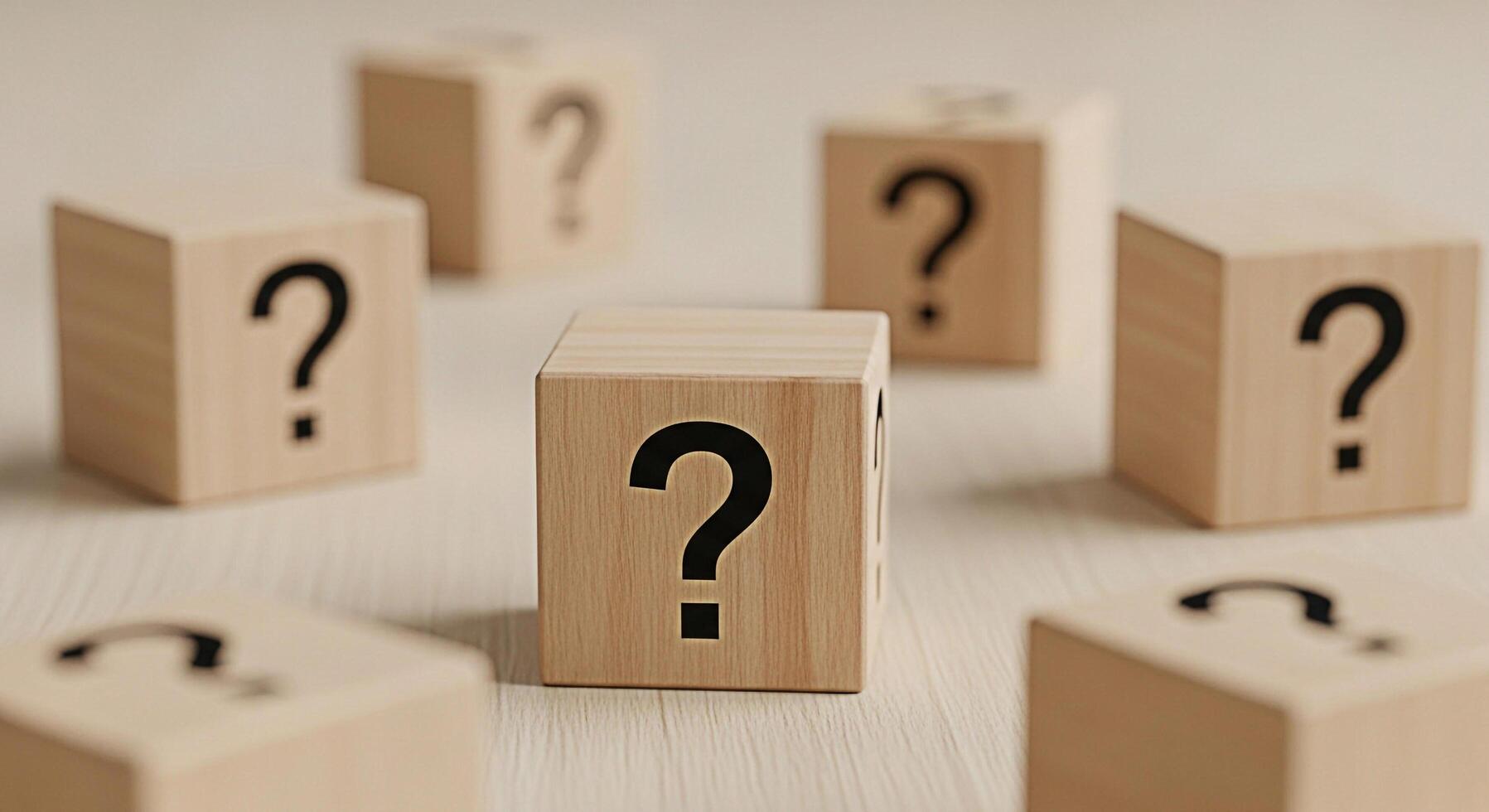 Wooden cubes displaying question marks on a light wooden surface symbolizing uncertainty and the need for answers in business education and personal life creating a mood of curiosity and inquiry photo
