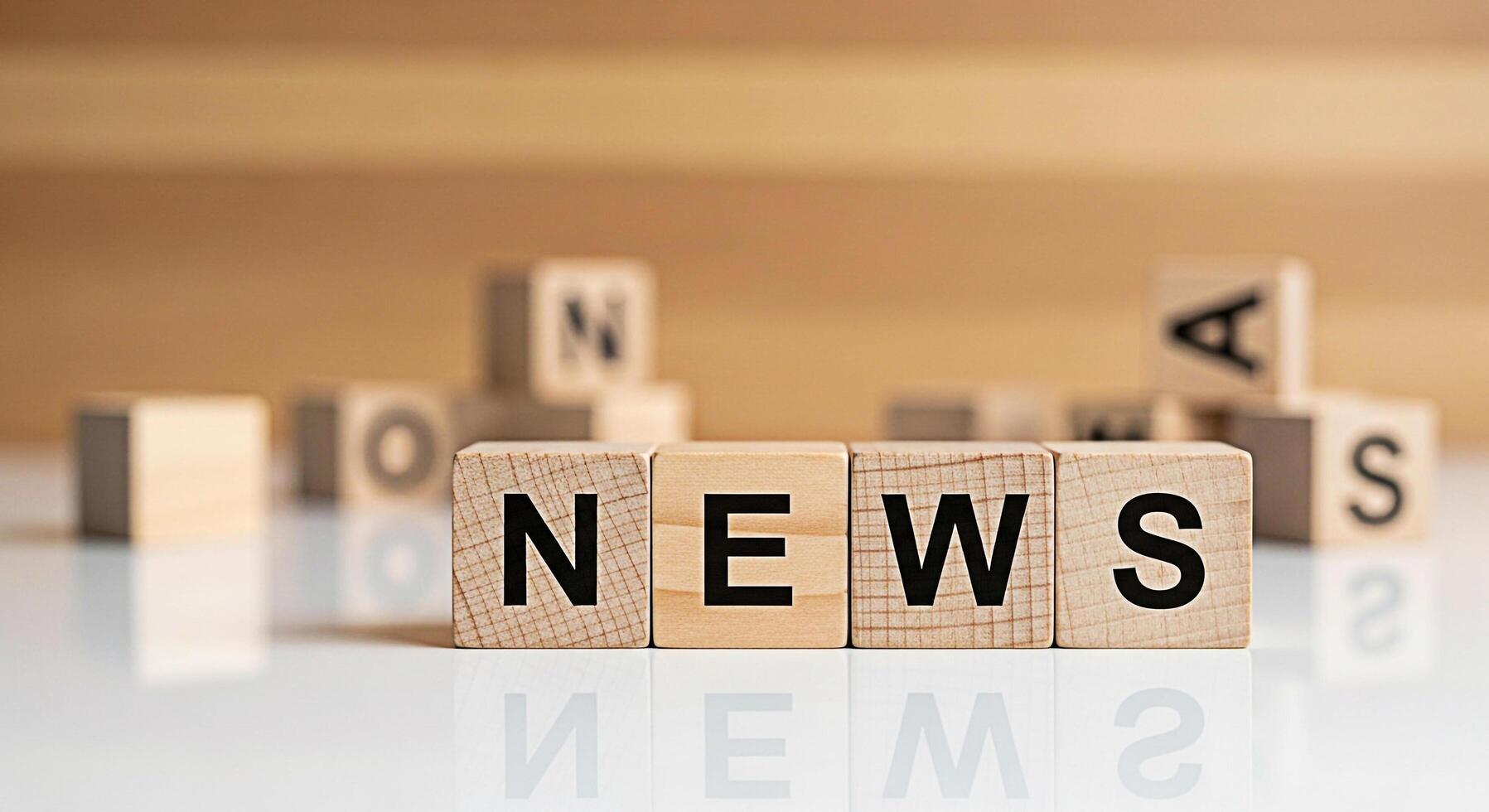 Wooden blocks spelling NEWS on a reflective surface in a studio setting conveying a message of information current events and media awareness in a simple and clean composition photo