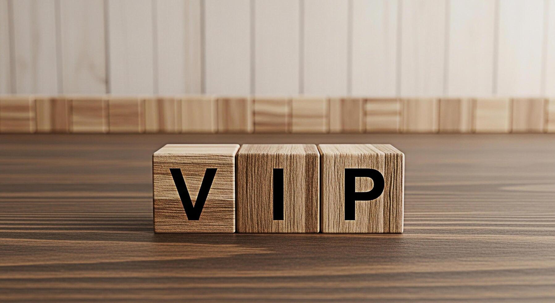 Wooden blocks spelling VIP on a wooden surface against a wood panel background representing exclusivity and premium access creating a sense of importance and privilege in a sophisticated setting photo