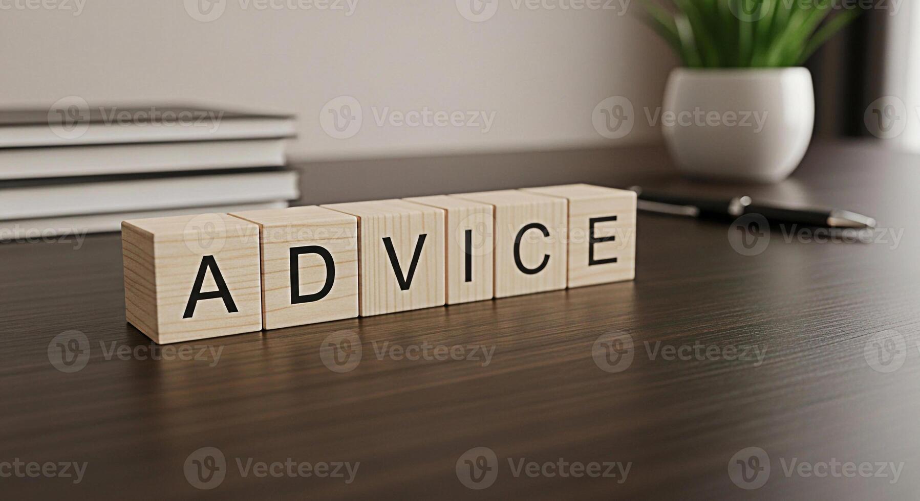 Wooden blocks spelling ADVICE on a desk offering guidance and support in a professional setting creating a sense of trust and reliability for business solutions and personal growth Pro Photo