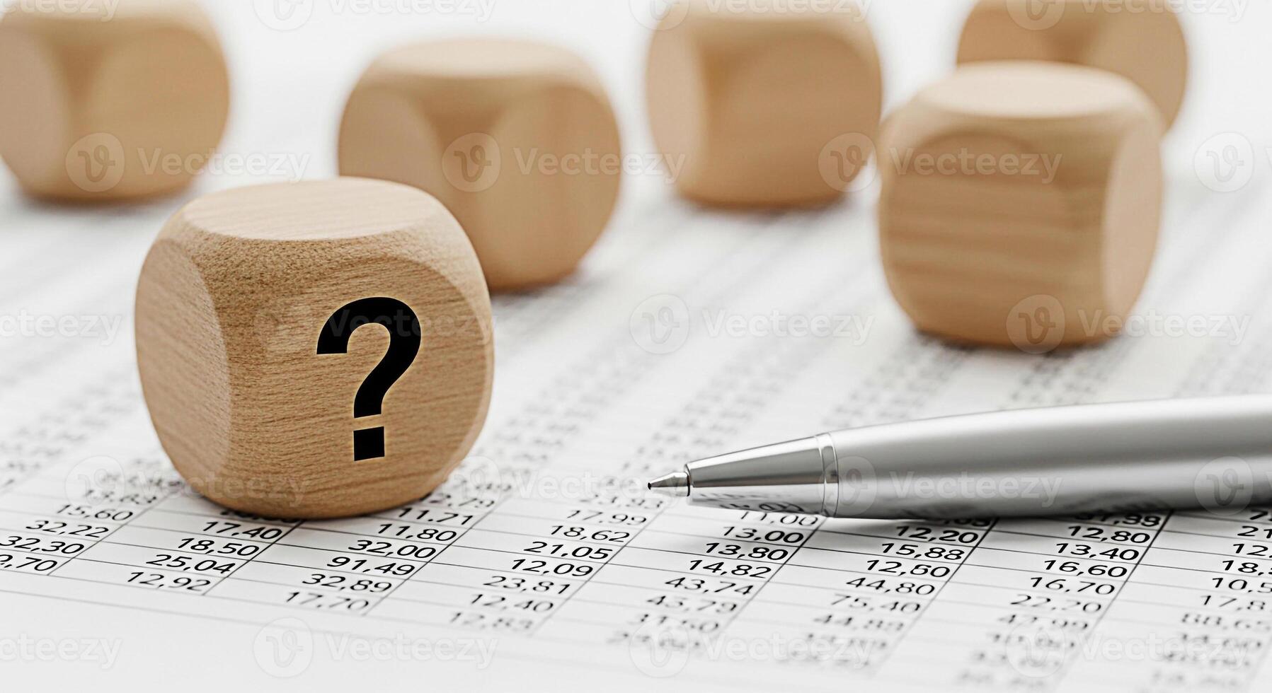 Wooden dice with a question mark resting on a financial spreadsheet with a pen symbolizing uncertainty in business and investment decisions creating a sense of financial risk and analysis Pro Photo
