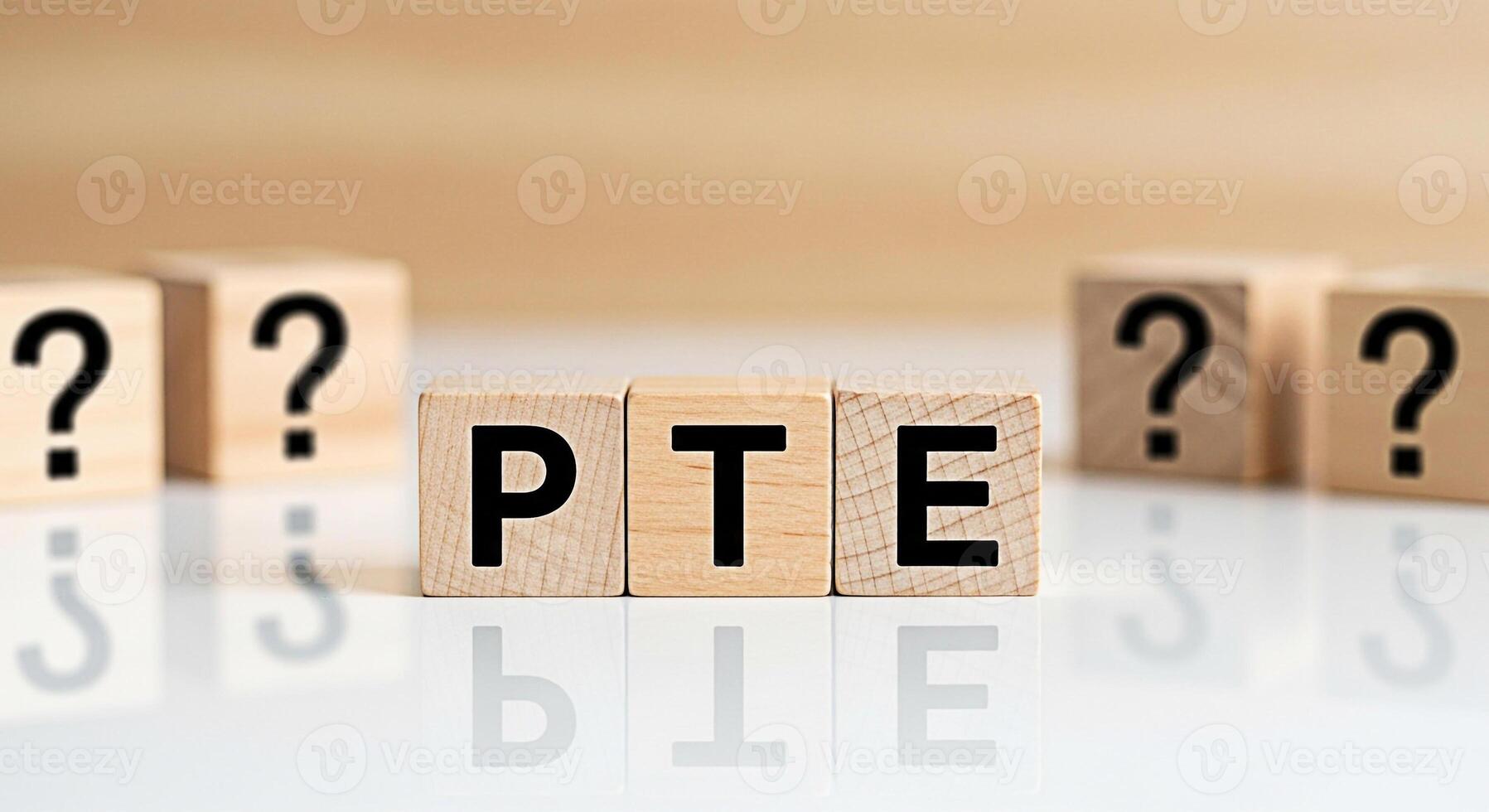 Wooden blocks spelling PTE on a reflective surface surrounded by question marks representing the Pearson Test of English and the uncertainty of exam preparation creating a sense of challenge and antic Pro Photo