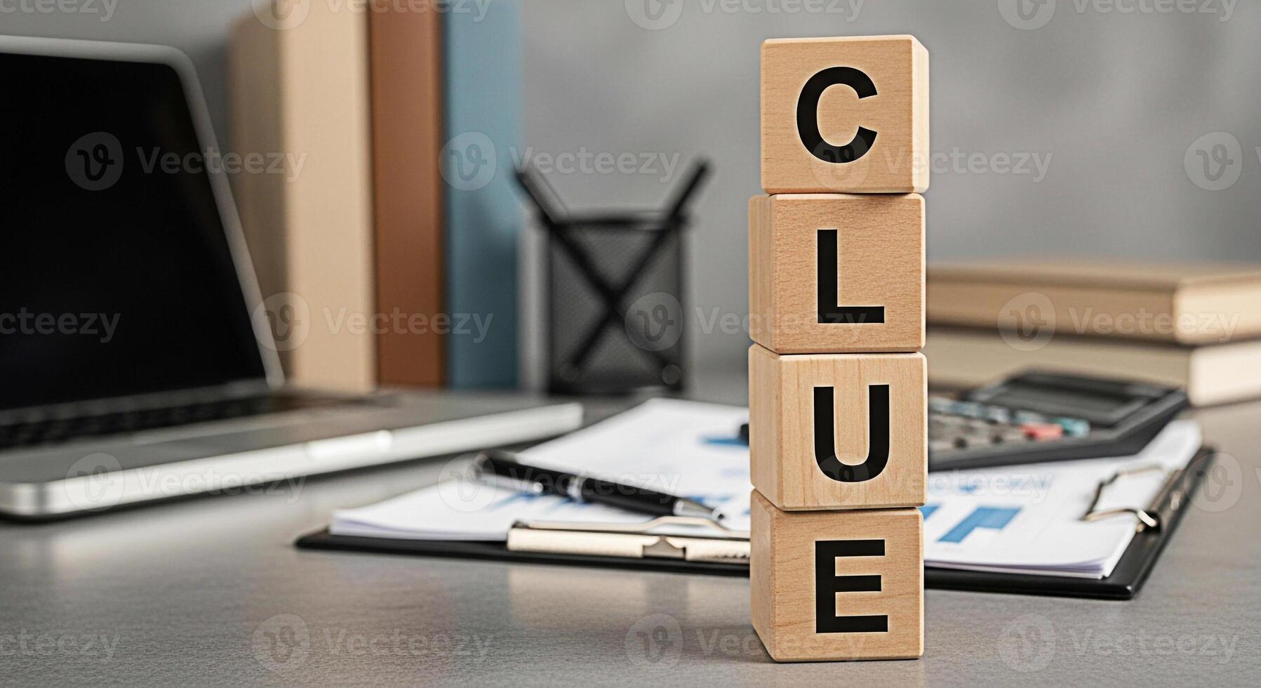Wooden blocks spelling CLUE on a desk with laptop financial reports and calculator representing problemsolving and investigation in a business or academic setting fostering a sense of discovery and an Pro Photo