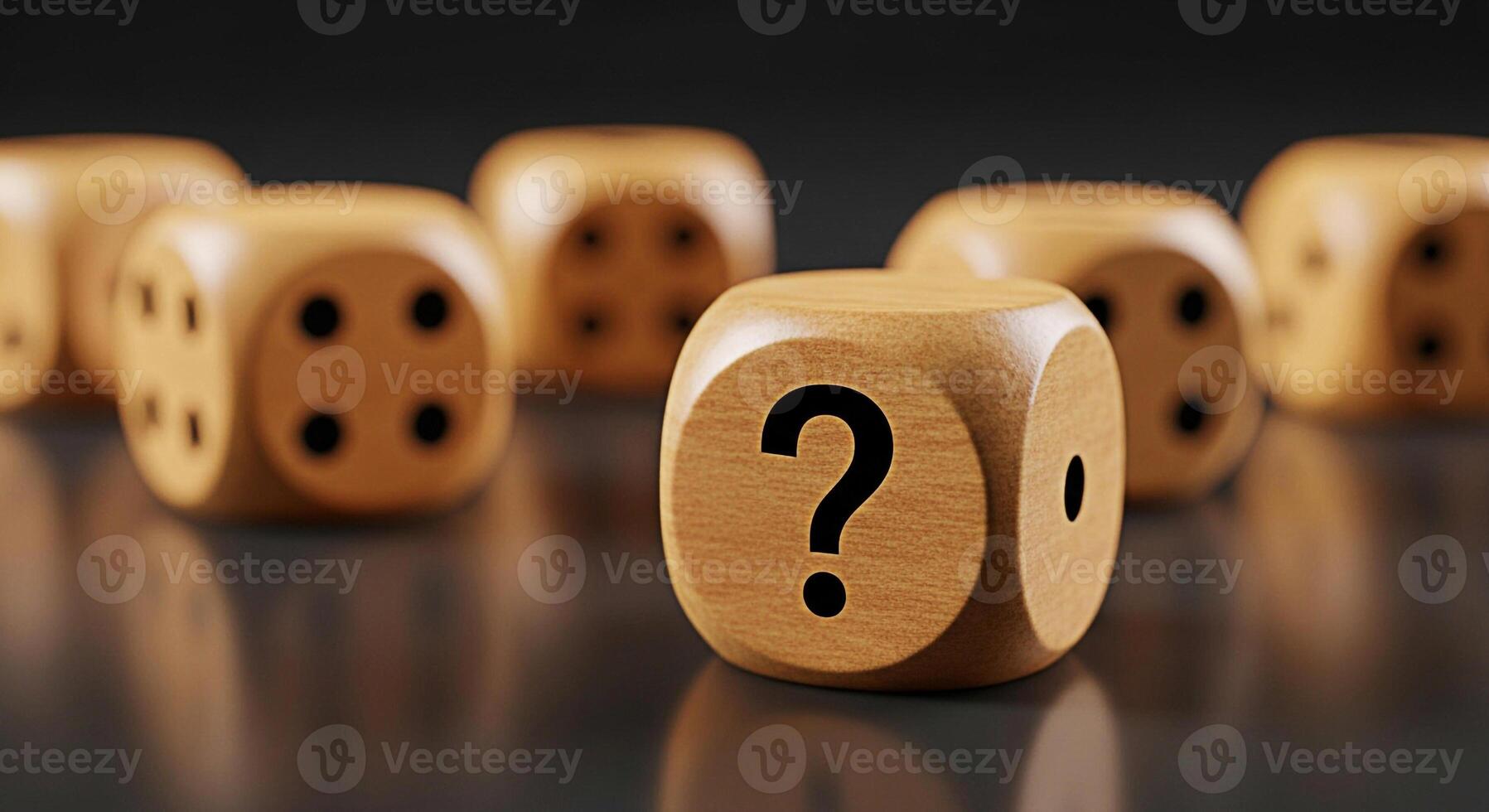 Wooden dice displaying a question mark on a reflective surface surrounded by other dice creating a sense of uncertainty and decisionmaking in a studio setting ideal for business concepts Pro Photo