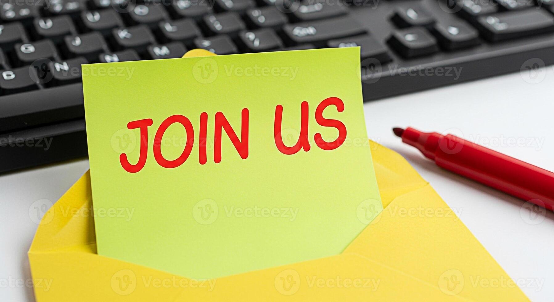 Bright yellow envelope with a Join Us note on a clean white desk next to a keyboard and red marker inviting participation and conveying a welcoming and inclusive message in a professional setting Pro Photo