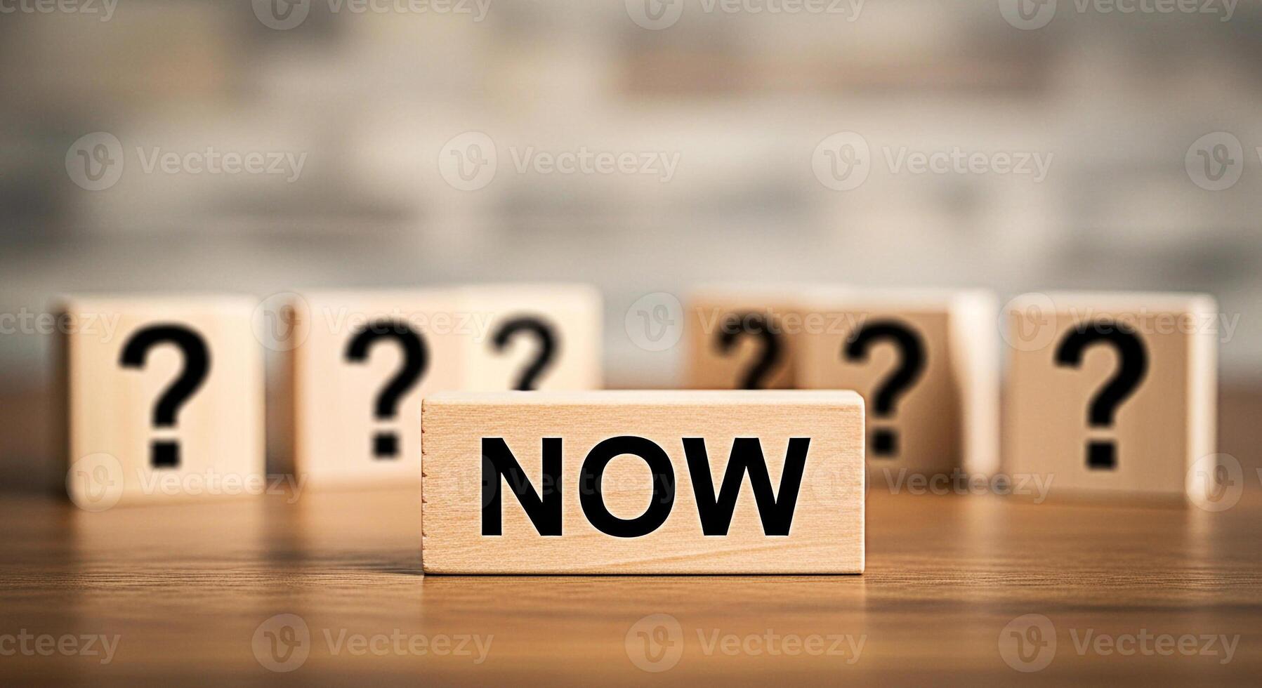 Wooden blocks displaying NOW among question marks on a wooden surface symbolizing decisionmaking and taking action in a timely manner creating a sense of urgency and opportunity in a blurred backgroun Pro Photo