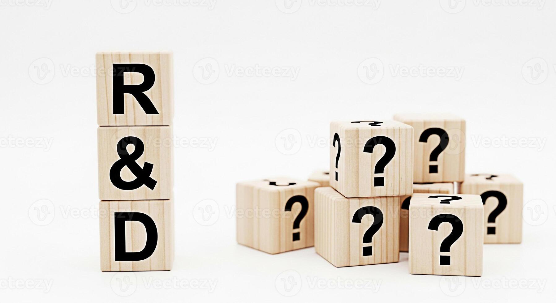 Wooden blocks displaying RD and question marks symbolizing research and development challenges and uncertainties in a bright minimalist setting conveying a sense of inquiry and problemsolving Pro Photo