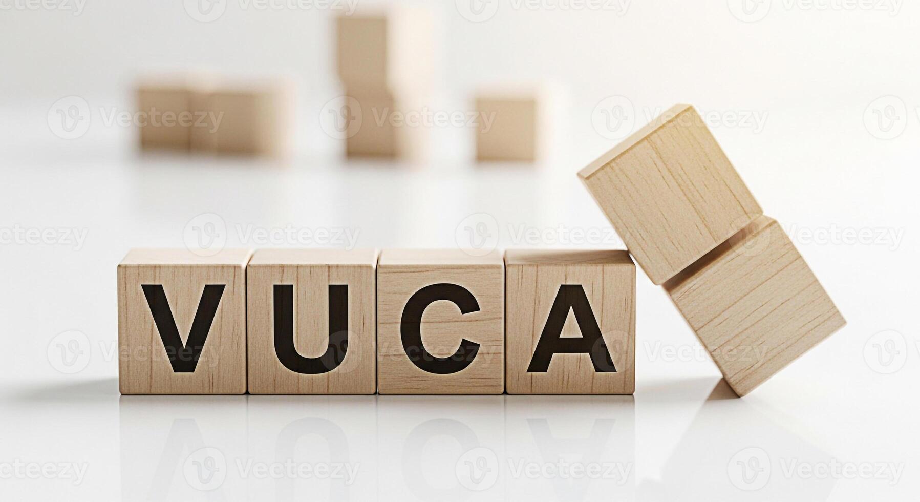 Wooden blocks spelling VUCA on a white surface symbolizing volatility uncertainty complexity and ambiguity in a business environment representing challenges and strategic decisionmaking for future suc Pro Photo