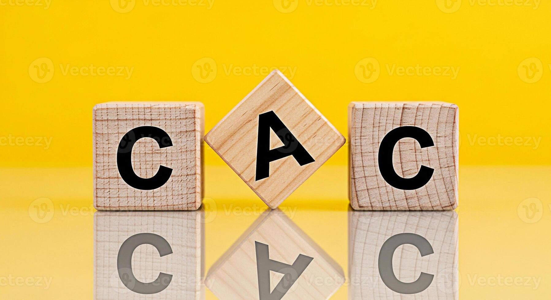 Three wooden blocks displaying CAC on a reflective yellow surface symbolizing Customer Acquisition Cost in a bright and minimalist setting conveying a clear and concise message about business metrics Pro Photo